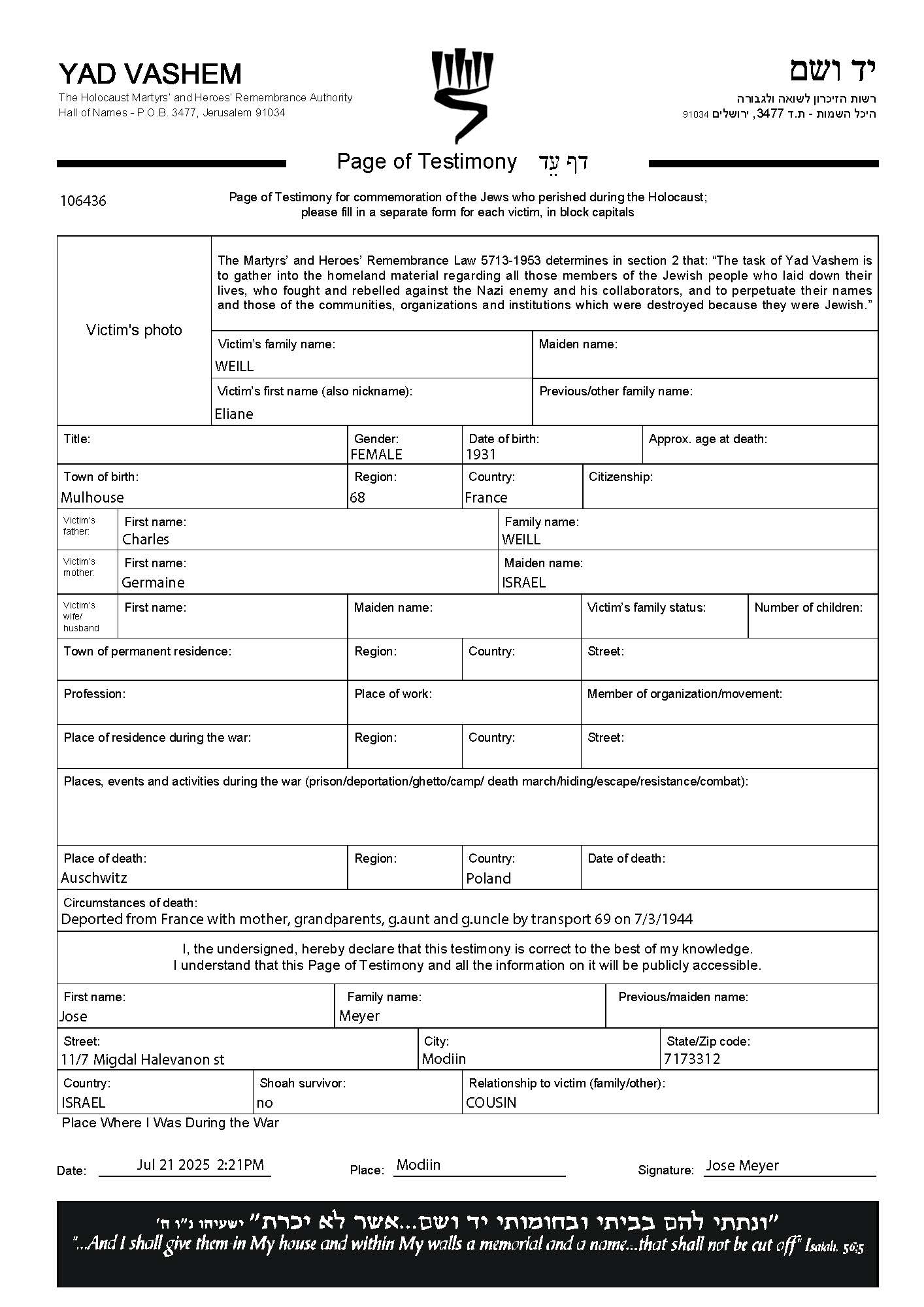 Eliane Weill was born in Mulhouse, France, 1931 to Charles and Germaine nee Israel. She was child. During the war she was in Auschwitz, Poland. Eliane was murdered in the Shoah. Place of death: Auschwitz, Poland.