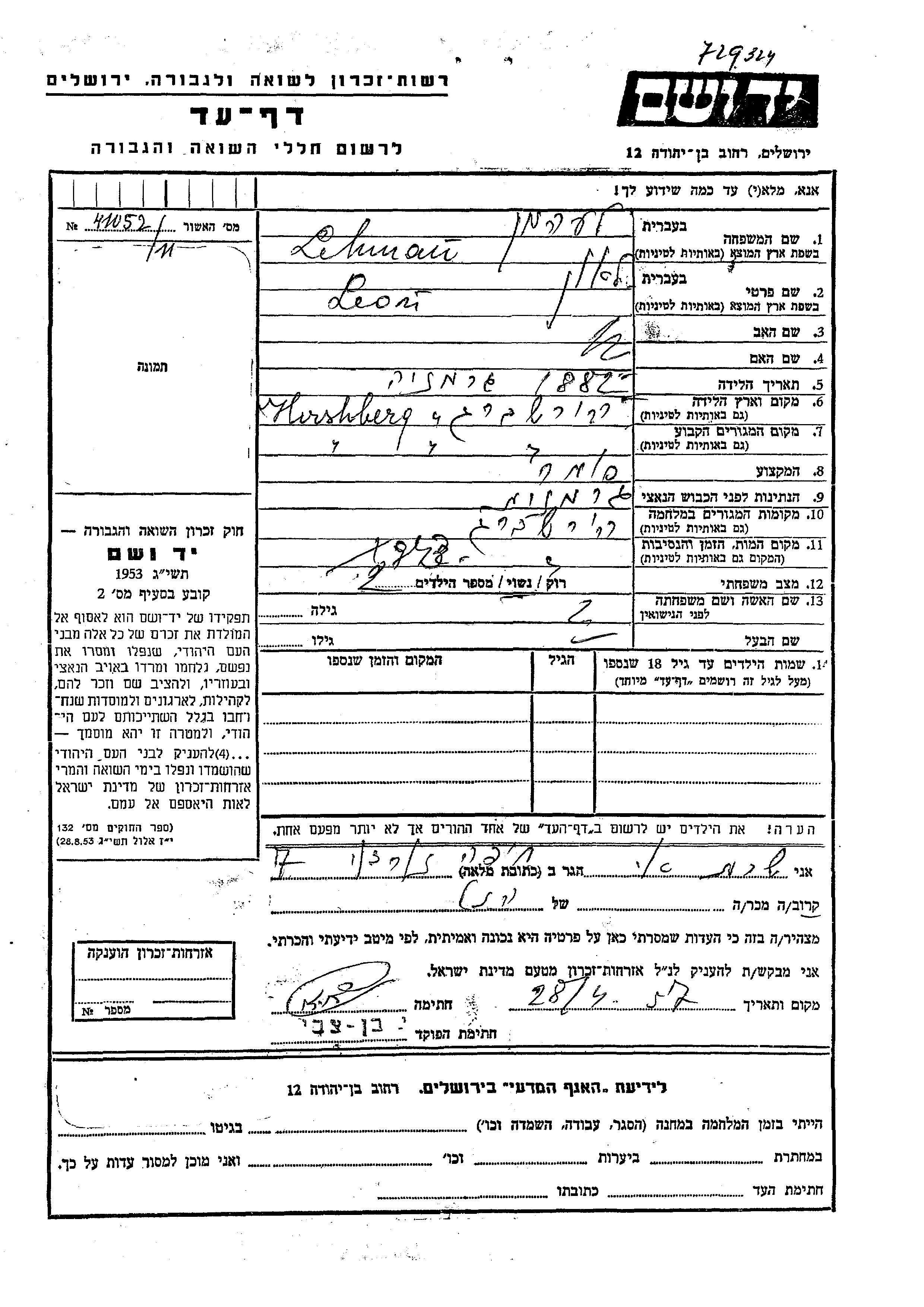 Lehman Leon 1882 Hirschberg, Germany Page of Testimony