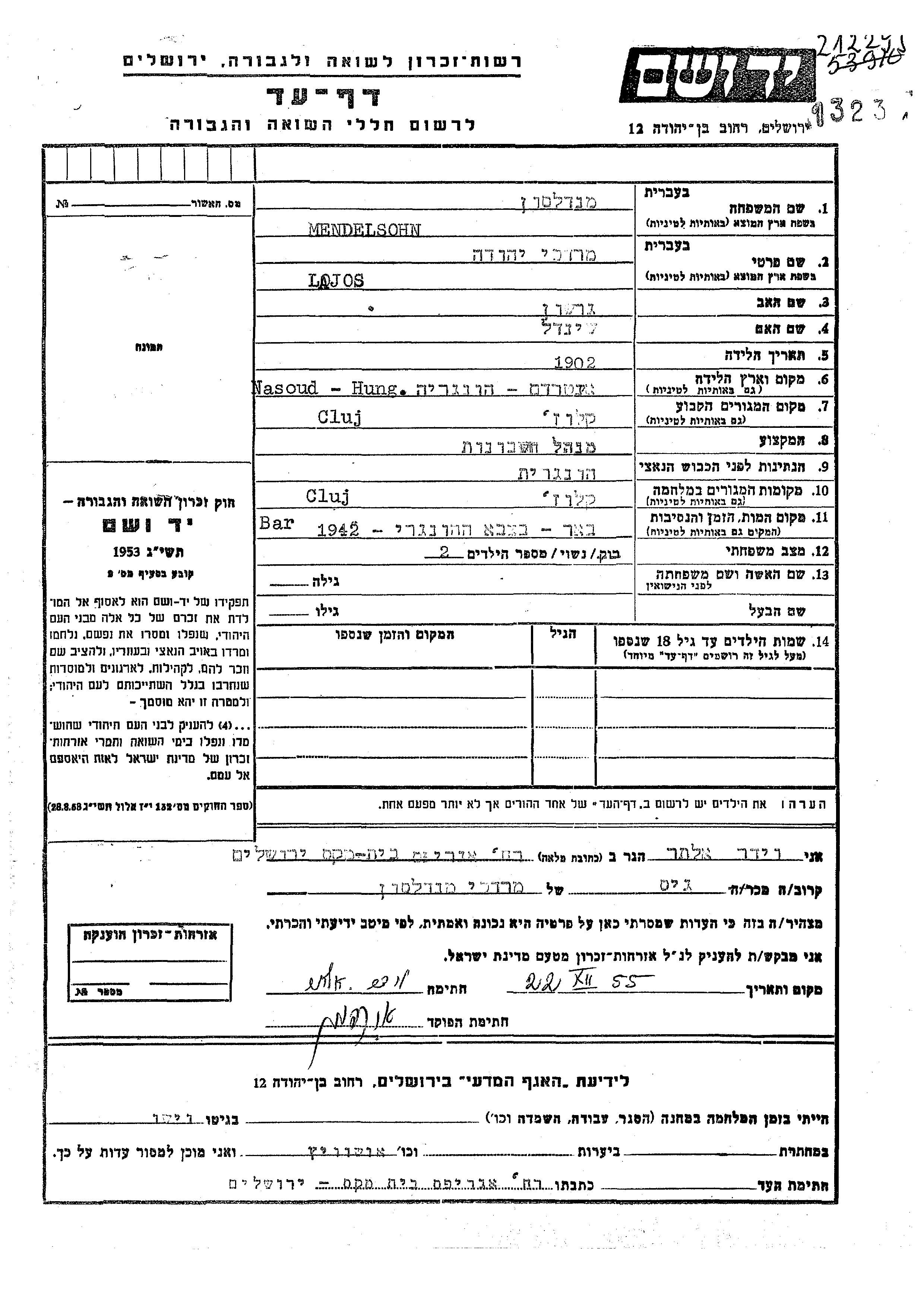 Mendelsohn Lajos Mordekhai Yehuda 1902 Cluj, Romania Page of Testimony