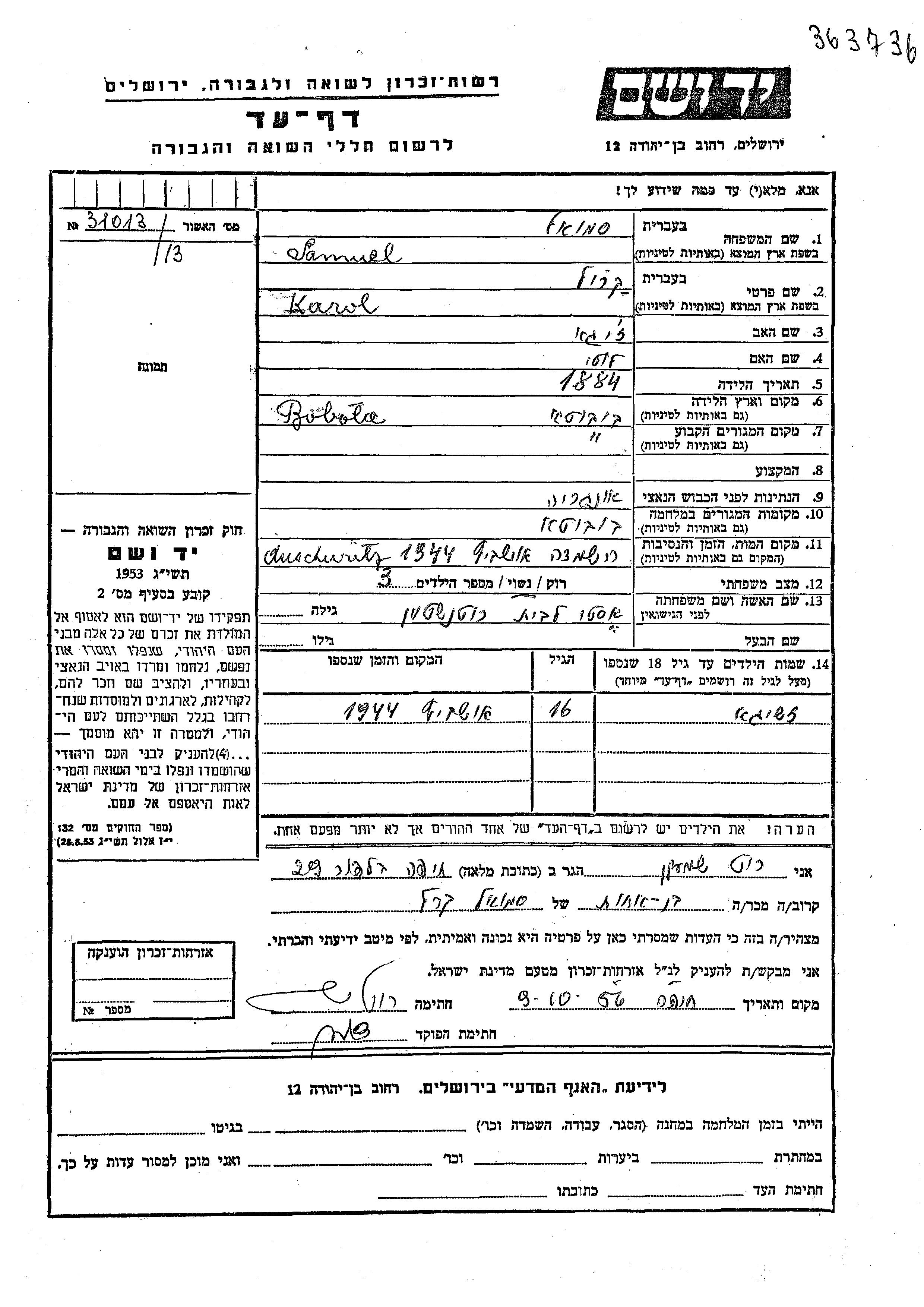 Samuel Karol 1884 Bobota, Romania Page of Testimony