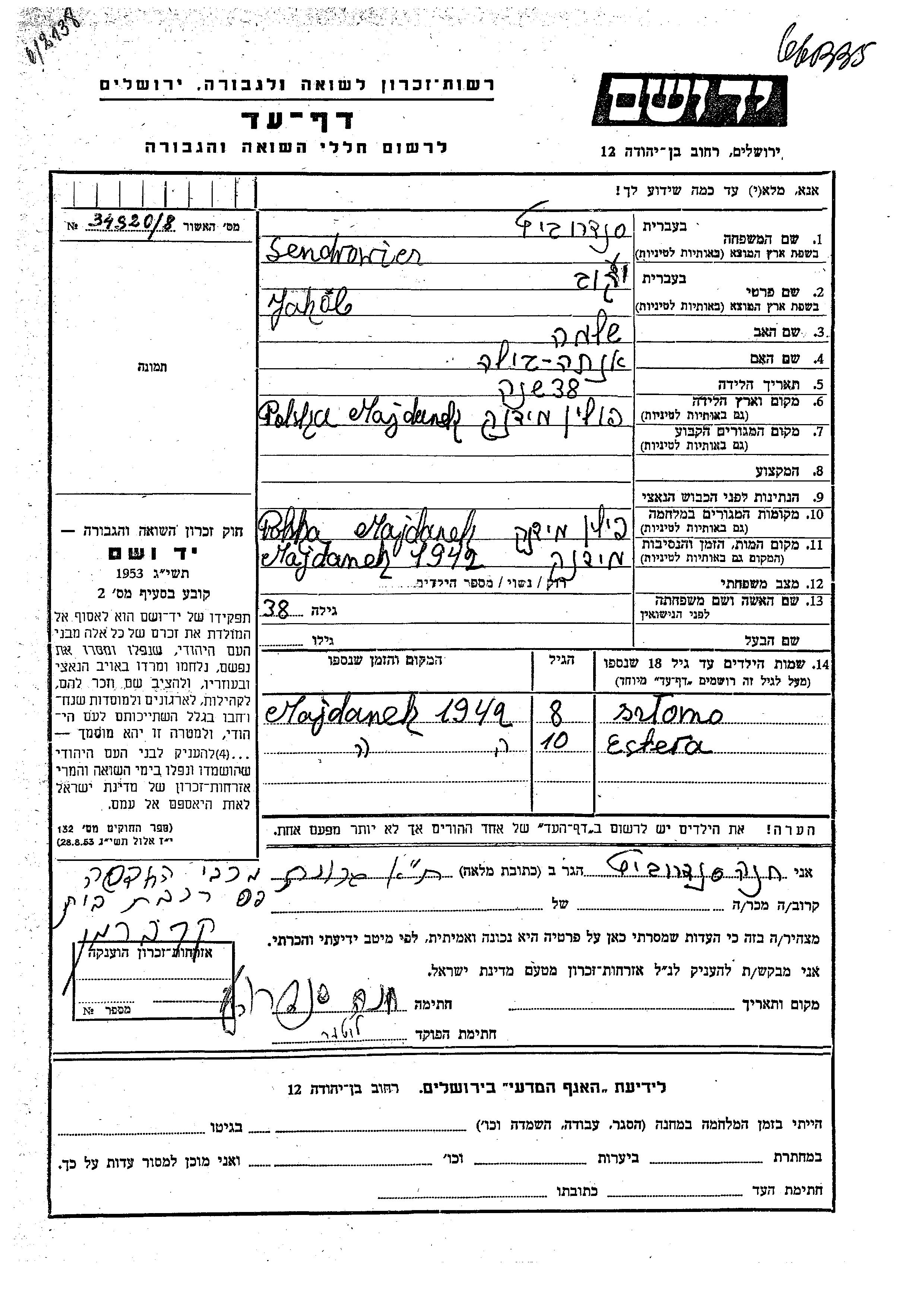 Yakob Sendrowicz was born in Majdanek, Poland to Shlomo and Enta Gila. During the war he was in Majdanek, Poland. Yakob was murdered in the Shoah. Place of death: Majdanek, Poland, 1942.