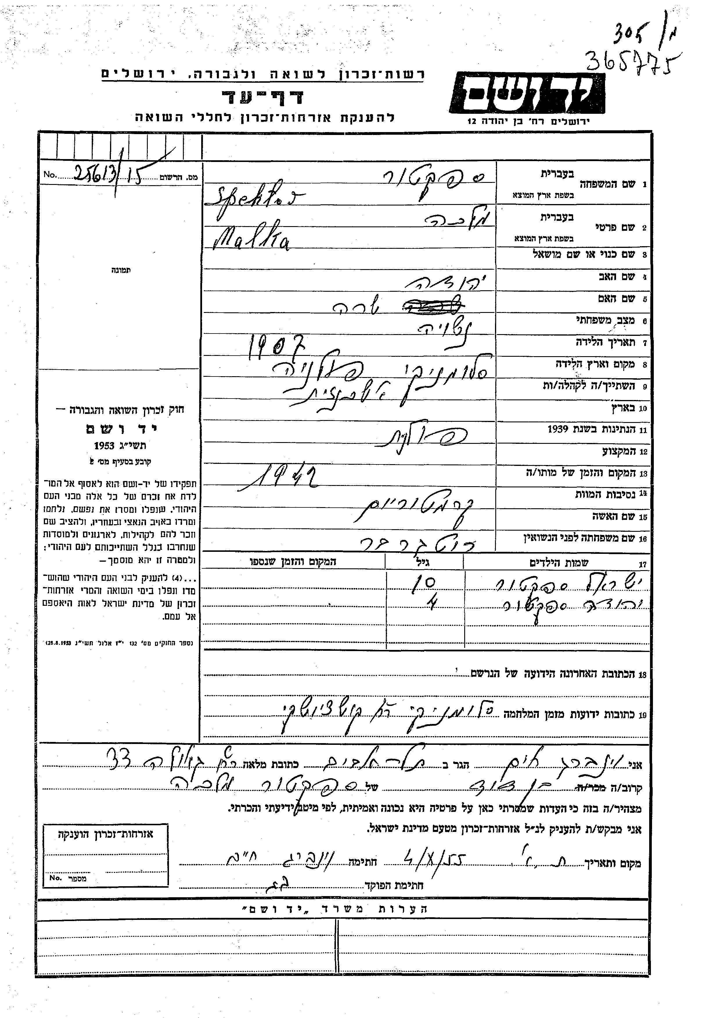 Spektor Malka 1907 Slomniki, Poland Page of Testimony