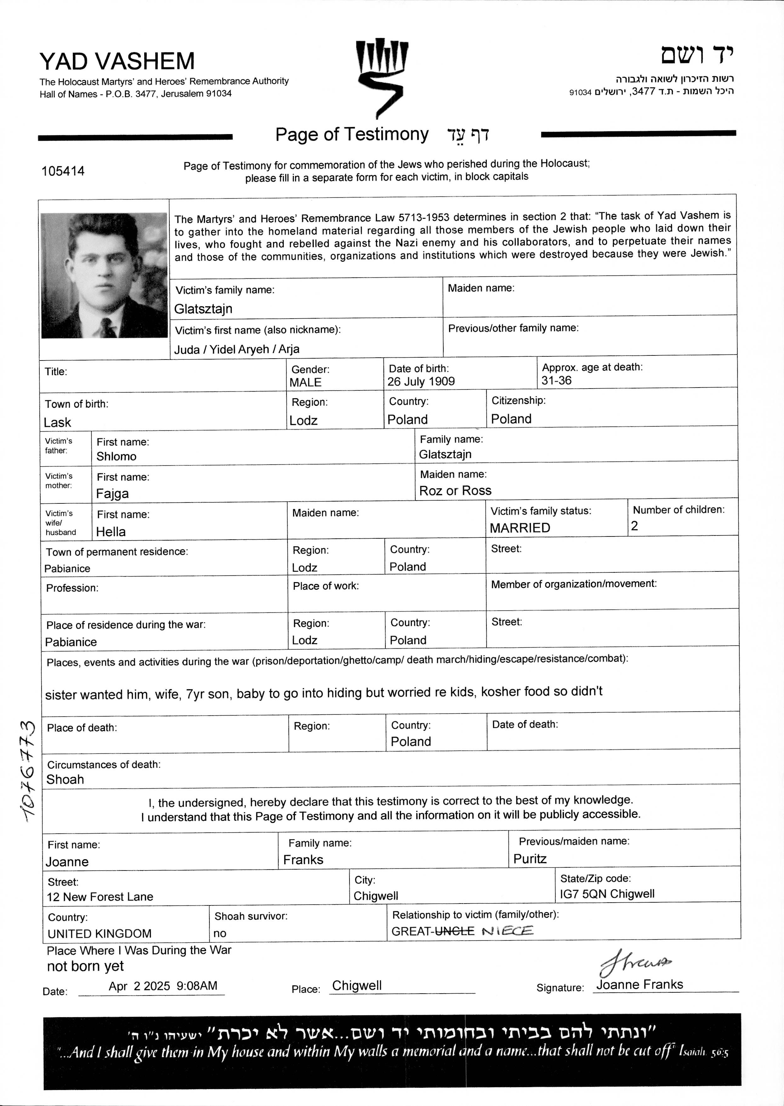 Juda Aryeh Glatsztajn was born in Lask, Poland, 1909. Prior to WWII he lived in Pabianice, Poland.