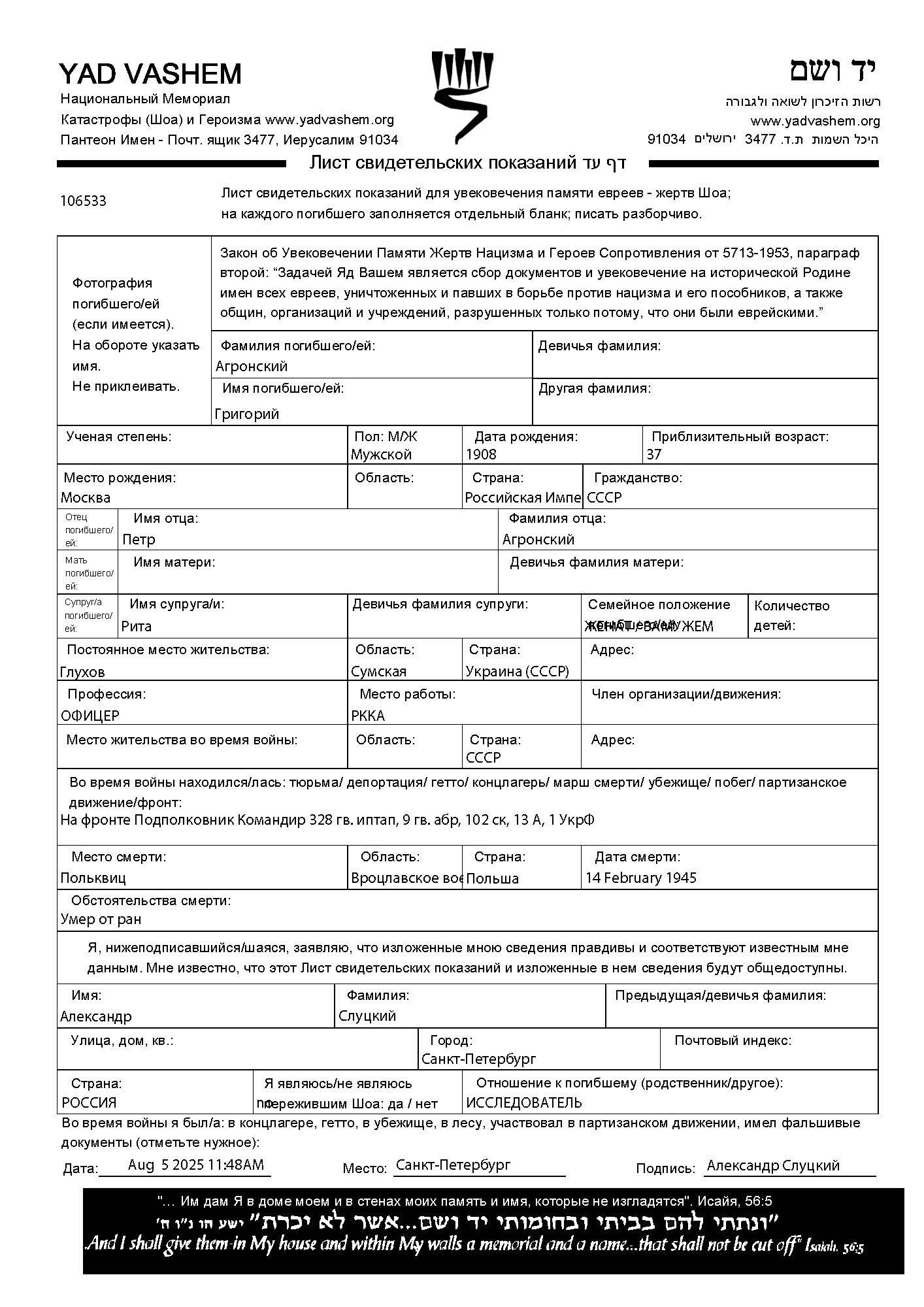 Grigoriy Agronskiy was born in Moskva, Russia (USSR), 1908 to Petr. He was an officer and married to Rita. Prior to WWII he lived in Glukhov, Ukraine (USSR). During the war he was in the Soviet armed forces. Grigoriy was killed in military service in WWII. Place of death: Polkowice, Germany, 14/02/1945.