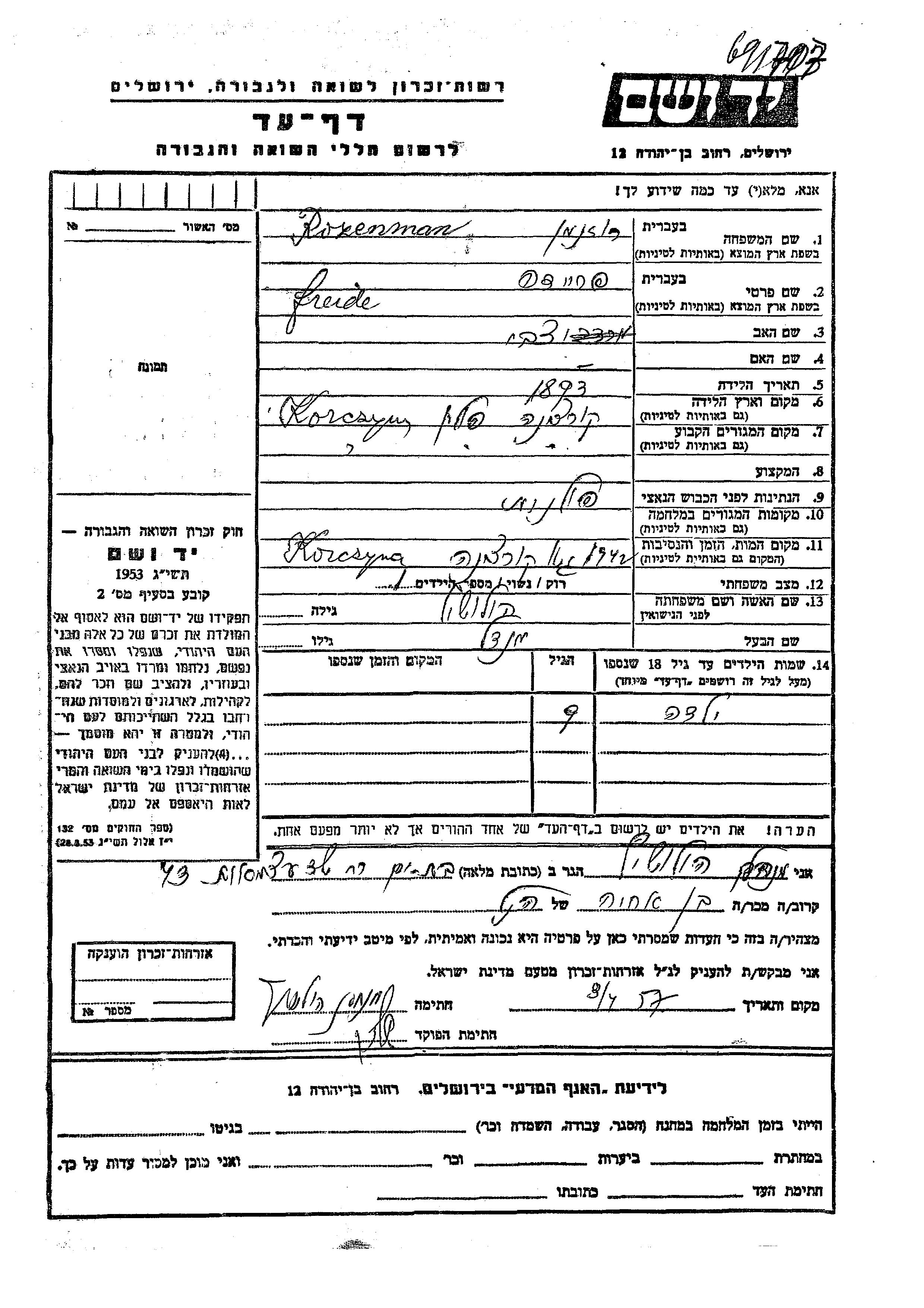 Zine Lea Rosenman was born in Korczyna, Poland, 1926. Prior to WWII she lived in Korczyna, Poland.