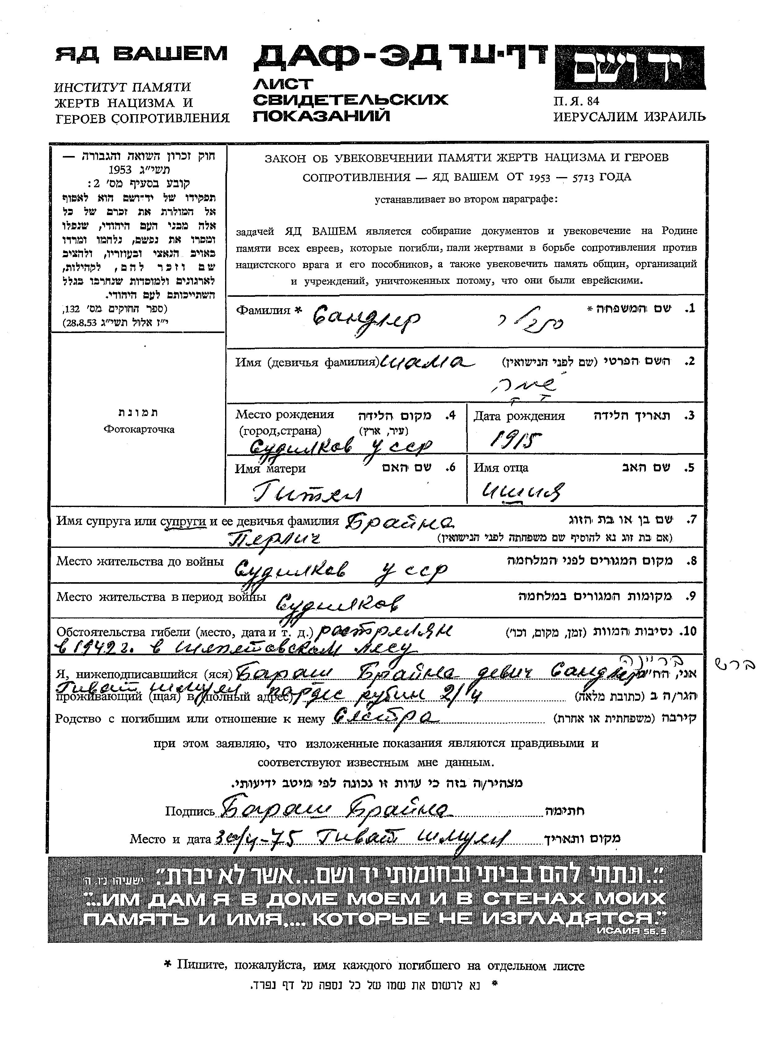 | Sandler Barash | Braina | Sudilkov, Ukraine (USSR) | Page of Testimony |