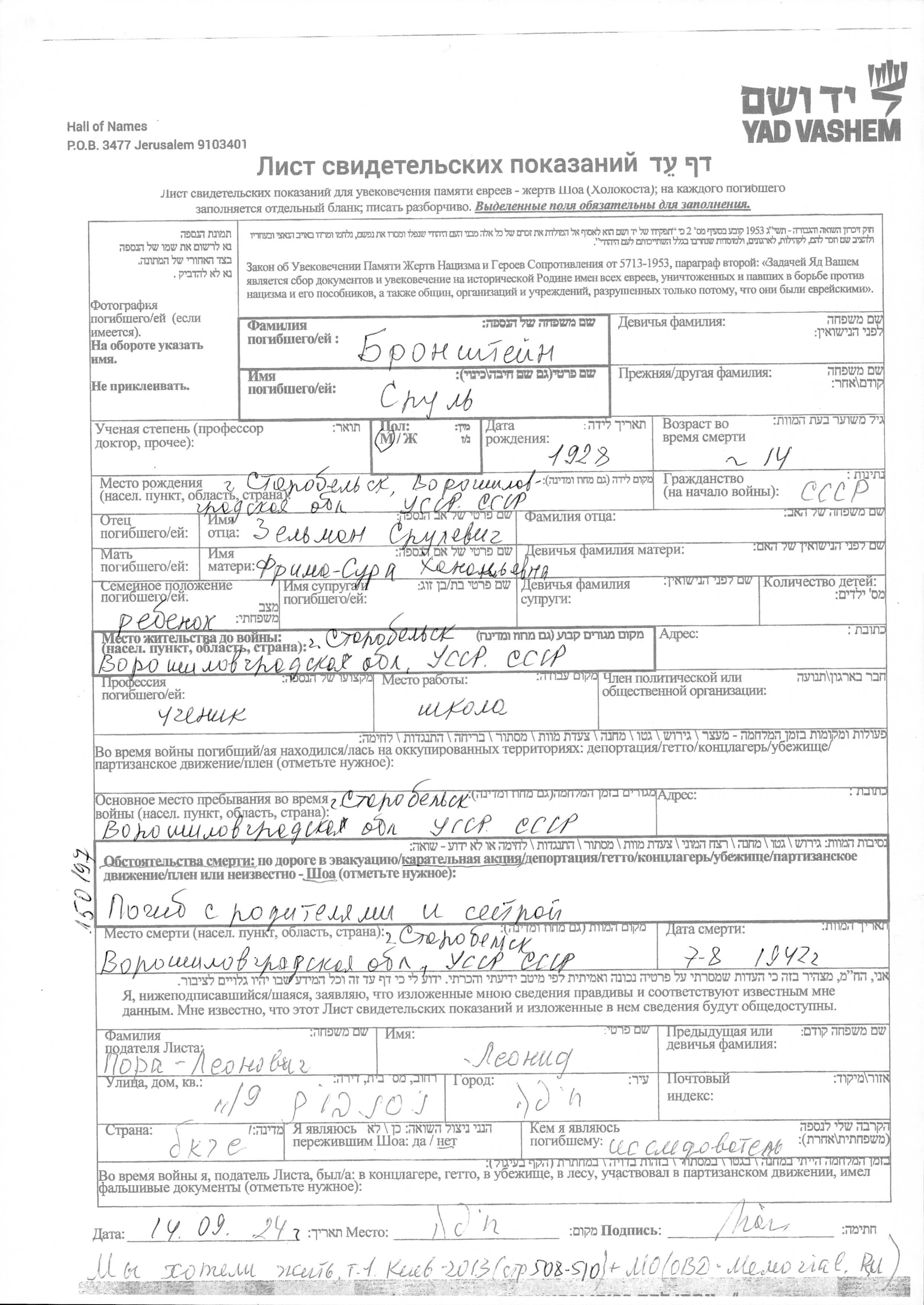 Srul Bronshteyn was born in Starobelsk, Ukraine (USSR), 1928 to Zelman and Frima Sura. He was a pupil and child. Prior to WWII he lived in Starobelsk, Ukraine (USSR). During the war he was in Starobelsk, Ukraine (USSR). Srul was murdered in the Shoah. Place of death: Starobelsk, Ukraine (USSR), 07/1942.