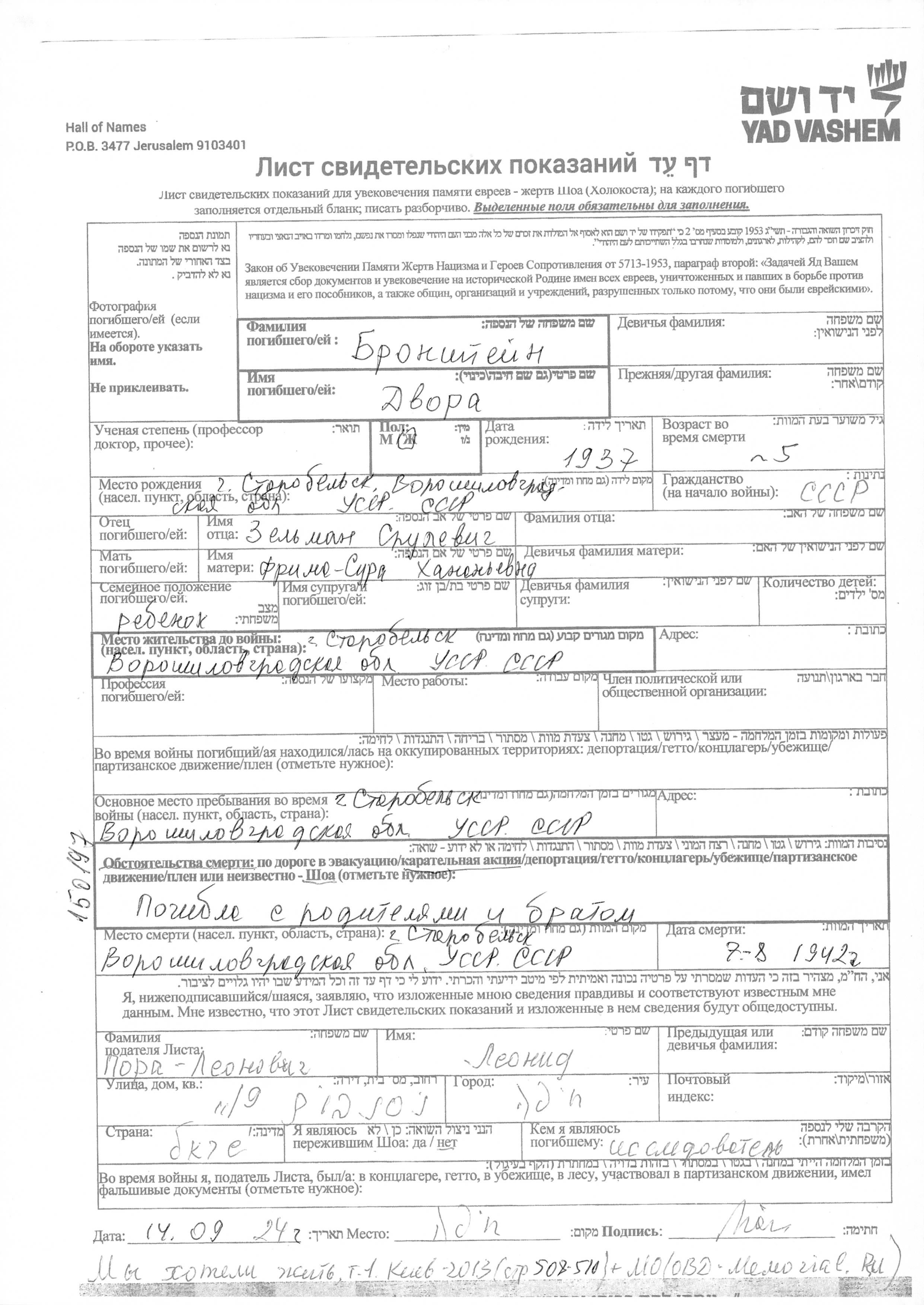Dvora Bronshteyn was born in Starobelsk, Ukraine (USSR), 1937 to Zelman and Frima Sura. She was child. Prior to WWII she lived in Starobelsk, Ukraine (USSR). During the war she was in Starobelsk, Ukraine (USSR). Dvora was murdered in the Shoah. Place of death: Starobelsk, Ukraine (USSR), 07/1942.