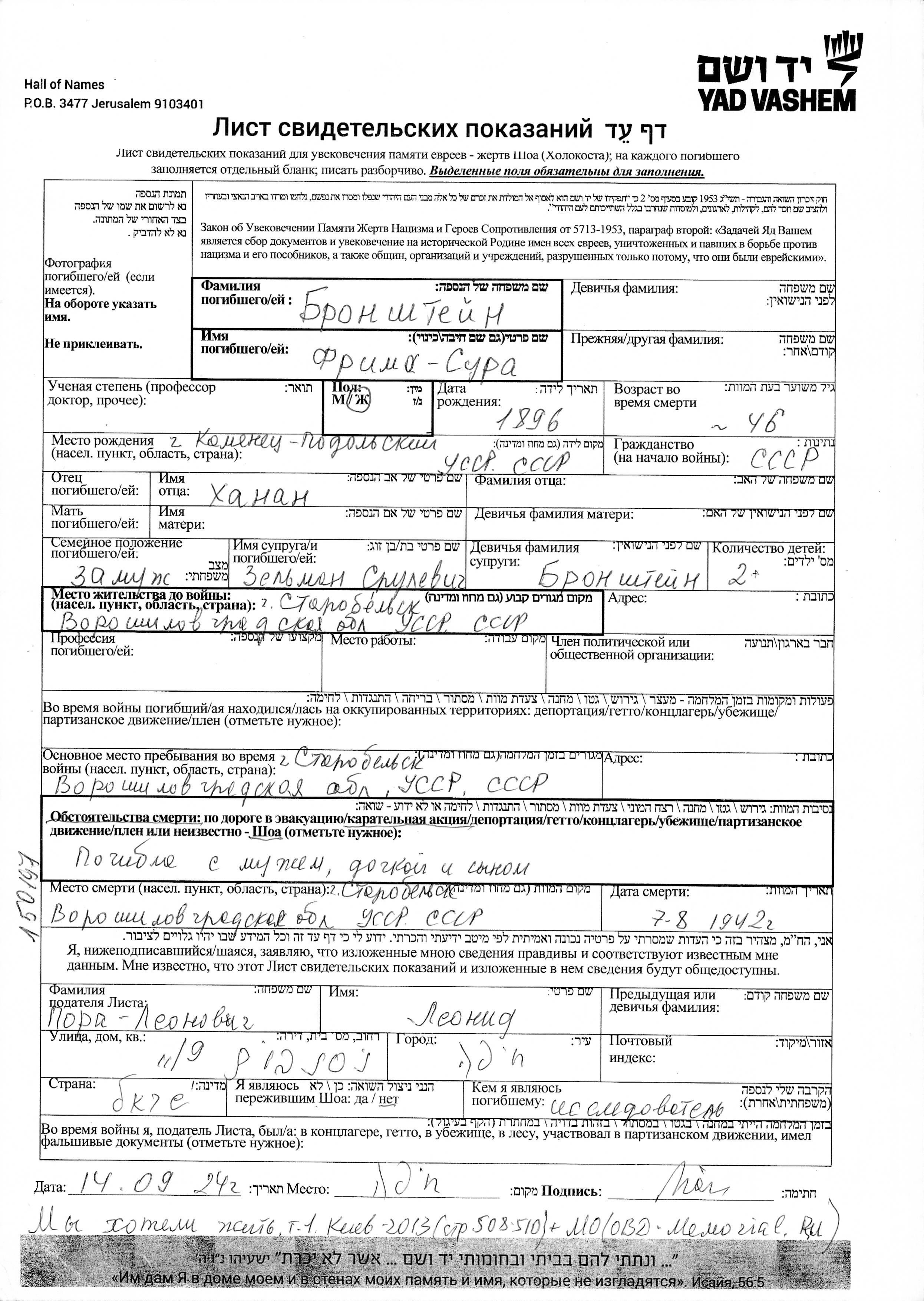Frima Sura Bronshteyn was born in Kamenets Podolskiy, Ukraine (USSR), 1896 to Khanan. She was married to Zelman. Prior to WWII she lived in Starobelsk, Ukraine (USSR). During the war she was in Starobelsk, Ukraine (USSR). Frima Sura was murdered in the Shoah. Place of death: Starobelsk, Ukraine (USSR), 07/1942.