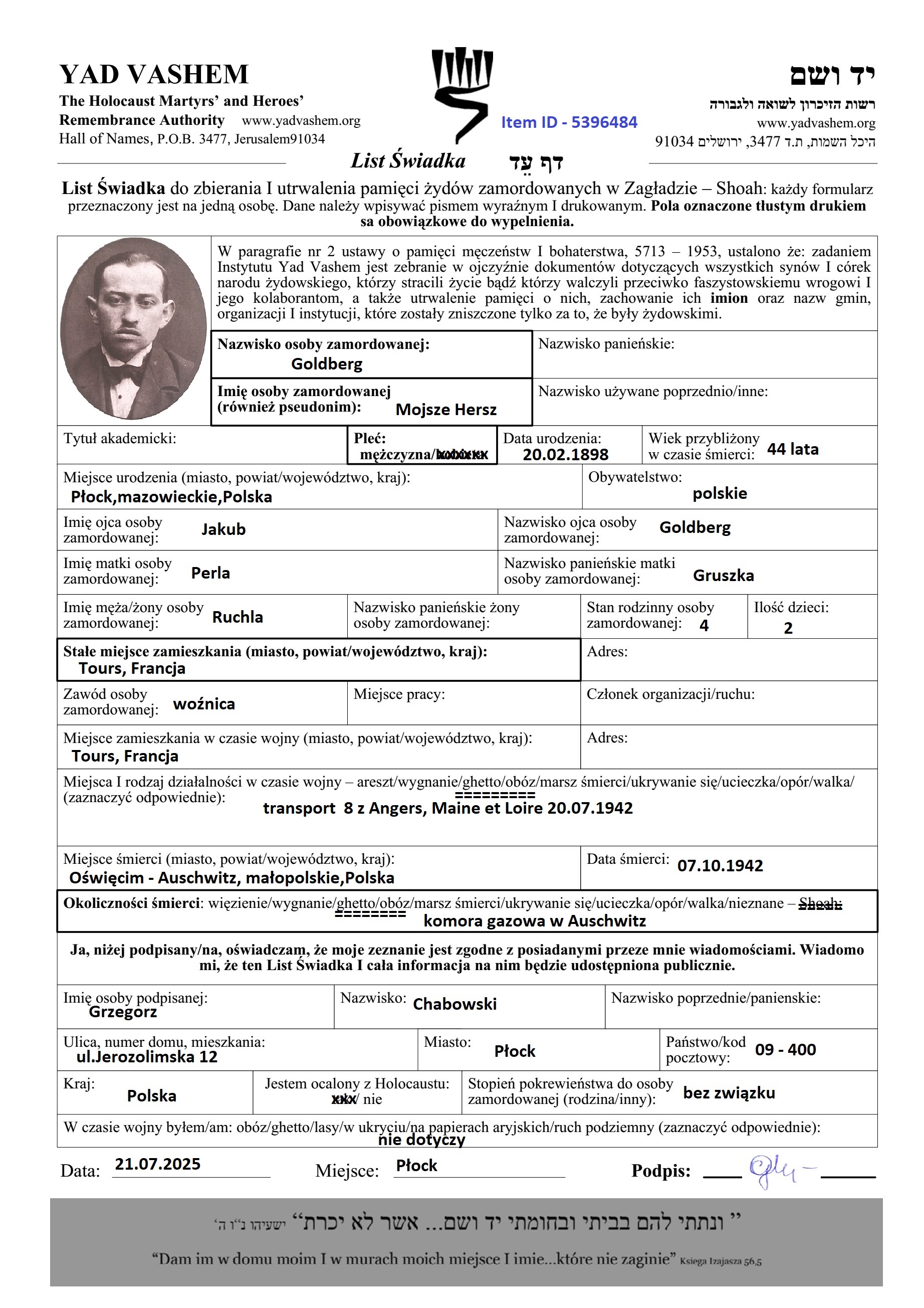 Goldberg Mojsze Hersz 1898 Tours, France Page of Testimony
