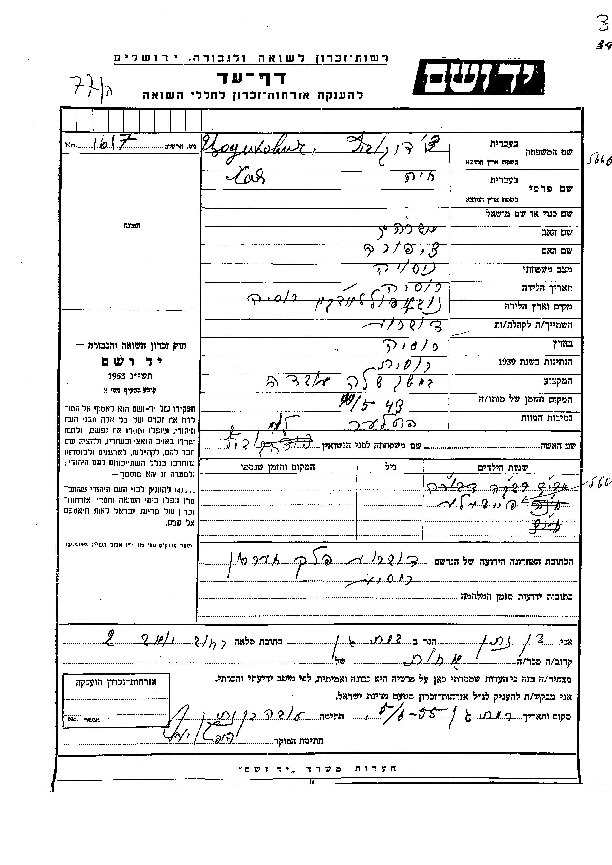 Yad Vashem - Pages of Testimony Names Memorial Collection