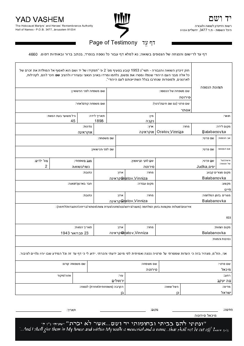 Mikhael Sirota was born to Judka Yefim and Ester. Prior to WWII he lived in Balabanovka, Ukraine (USSR). During the war he was in Balabanovka, Ukraine (USSR). Mikhael survived the Shoah.