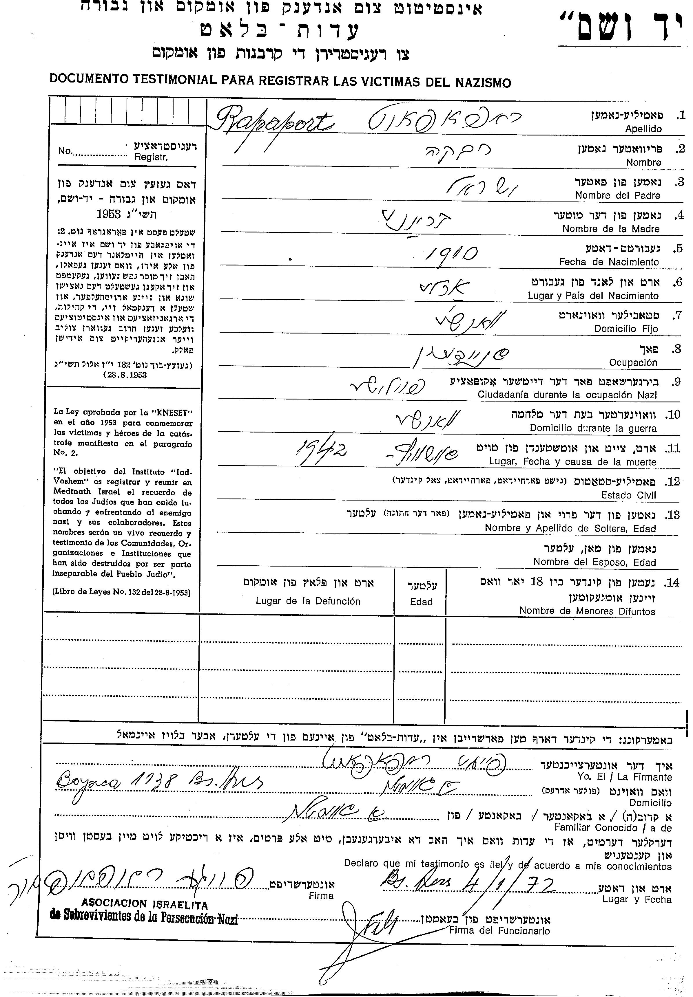 Rivka Rapaport was born in Orly, Poland, 1910 to Yisrael and Braine. She was a seamstress. Prior to WWII she lived in Warszawa, Poland. During the war she was in Warszawa, Poland. Rivka was murdered in the Shoah. Place of death: Auschwitz, Poland, 1942.