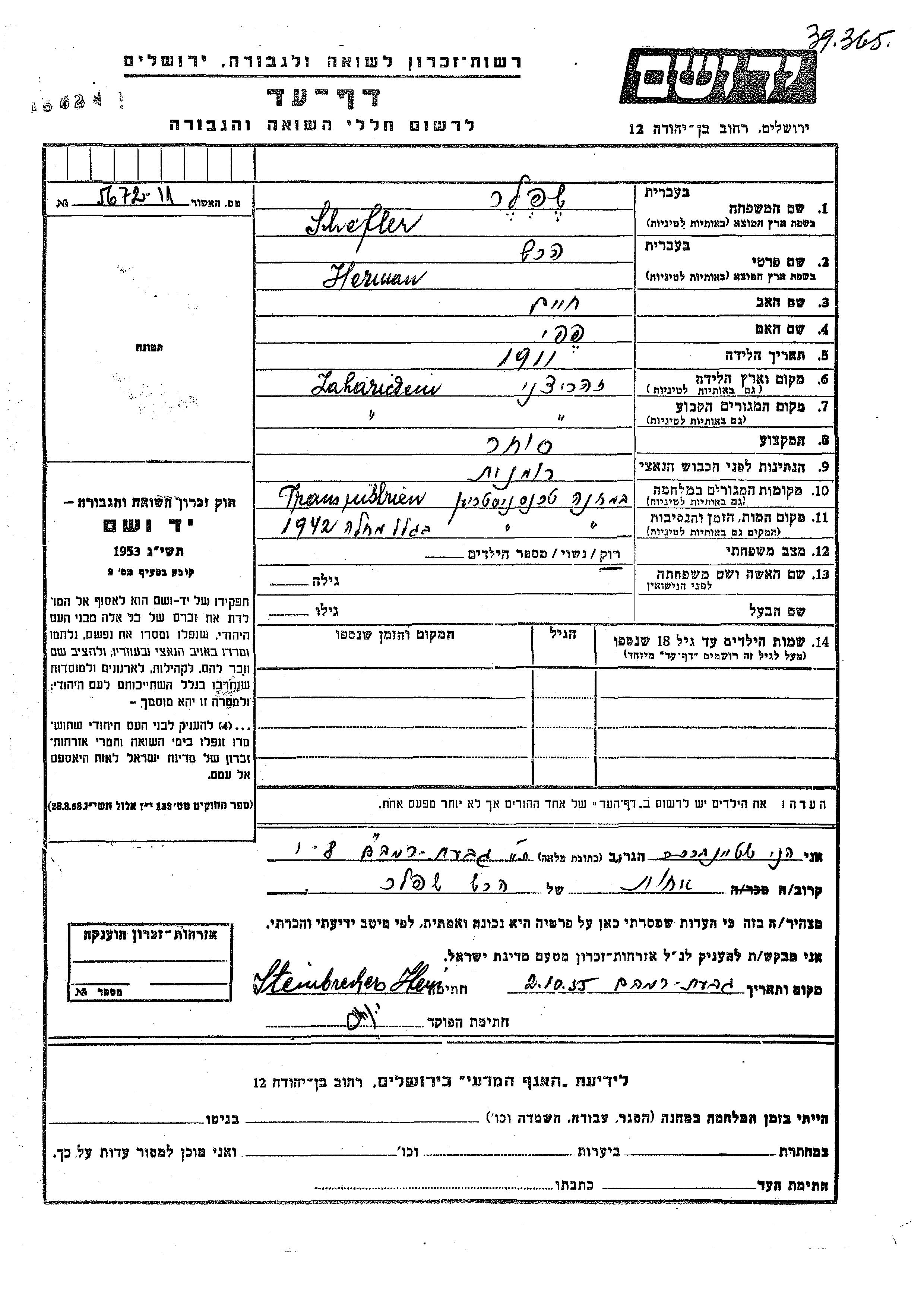 Shefler Hersh Herman 1911 Zaharesti, Romania Page of Testimony