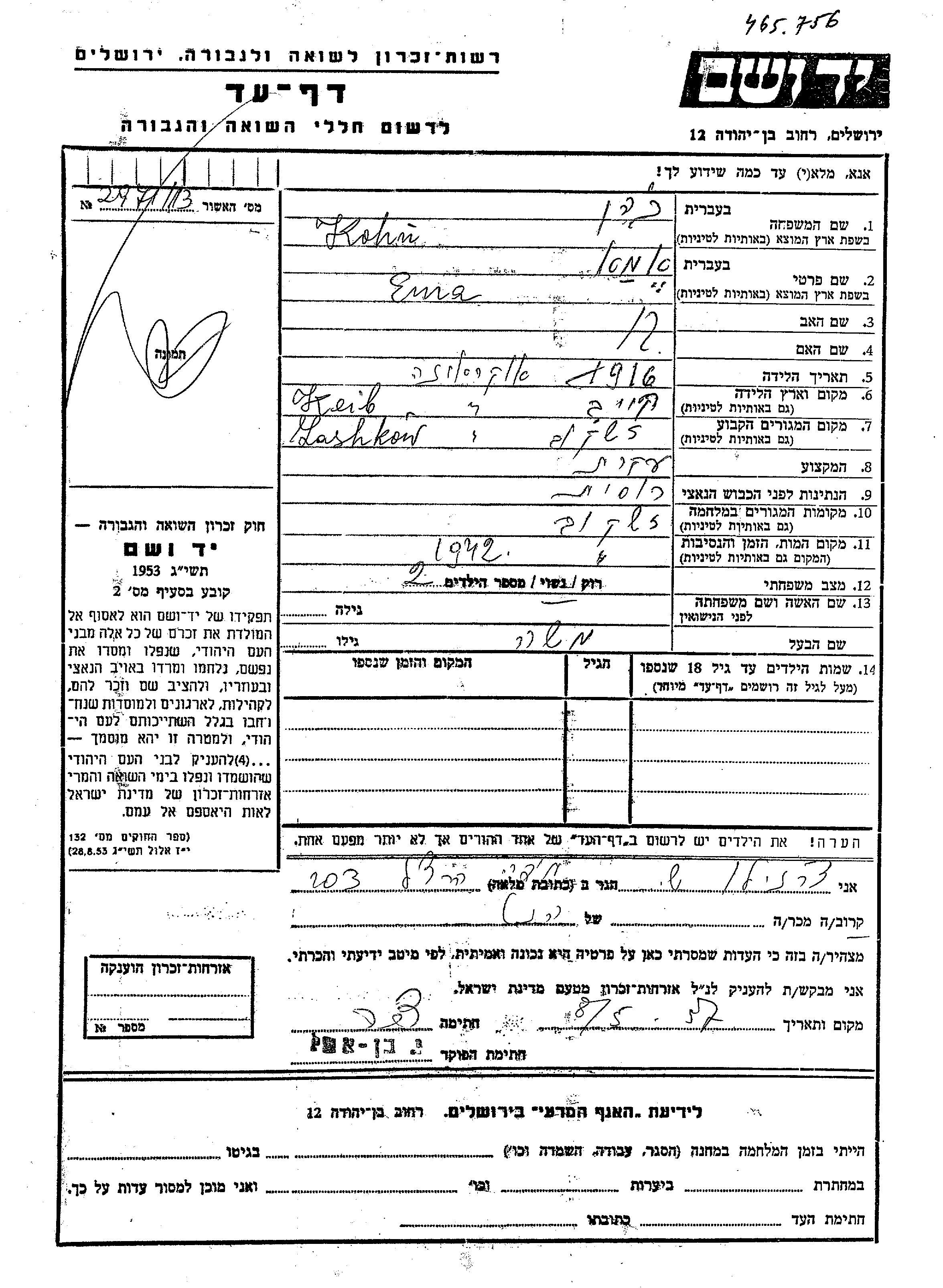 Ema Kohn was born in Kiev, Ukraine (USSR), 1916. She was a housewife and married to Moshe. Prior to WWII she lived in Zashkow, Poland. During the war she was in Zashkow, Poland. Ema was murdered in the Shoah. Place of death: Zashkow, Poland, 1942.