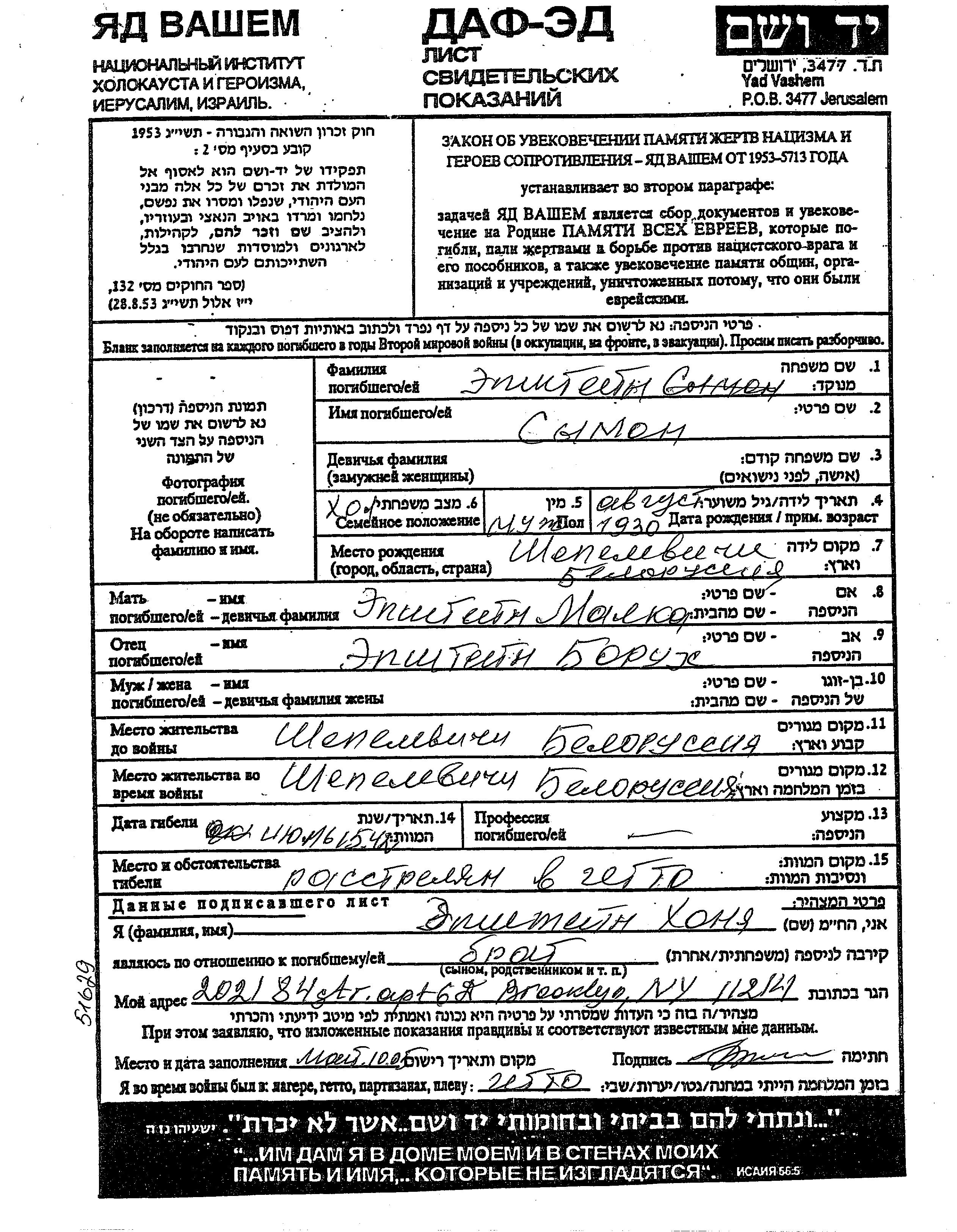 Epshtein Khonya Shepelevichi, Belorussia (USSR) Page of Testimony