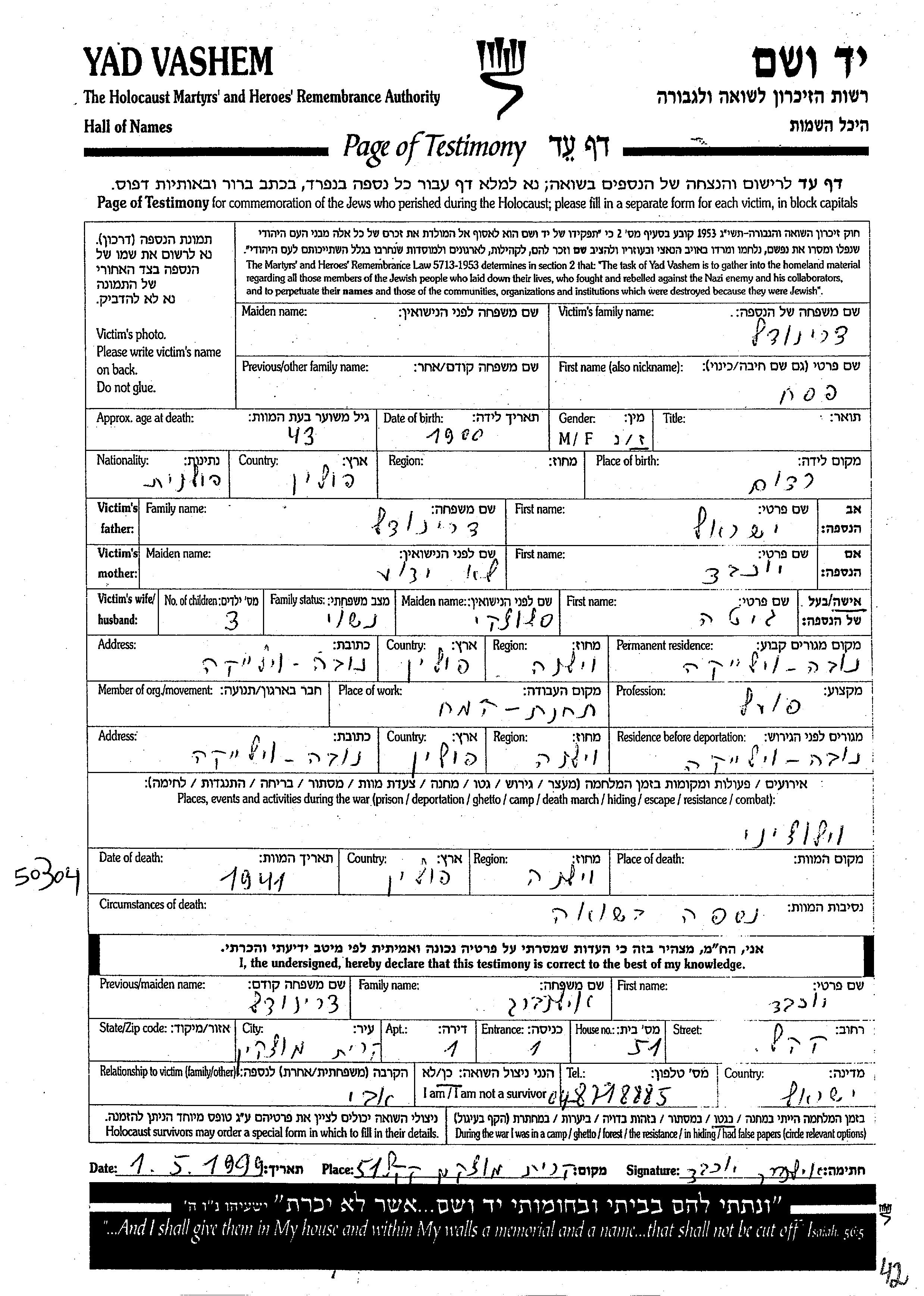 Yad Vashem - Pages of Testimony Names Memorial Collection