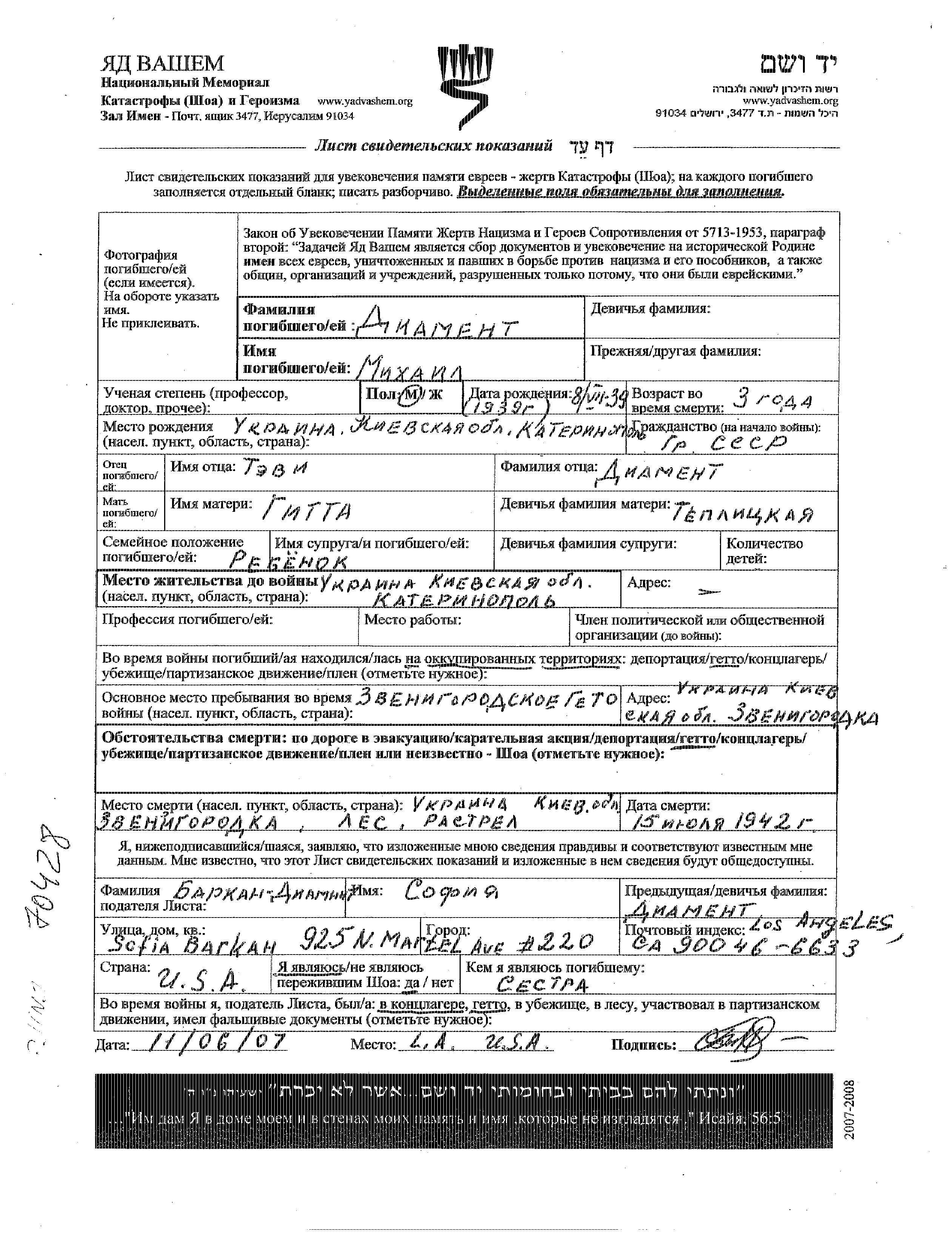 Yad Vashem - Pages of Testimony Names Memorial Collection