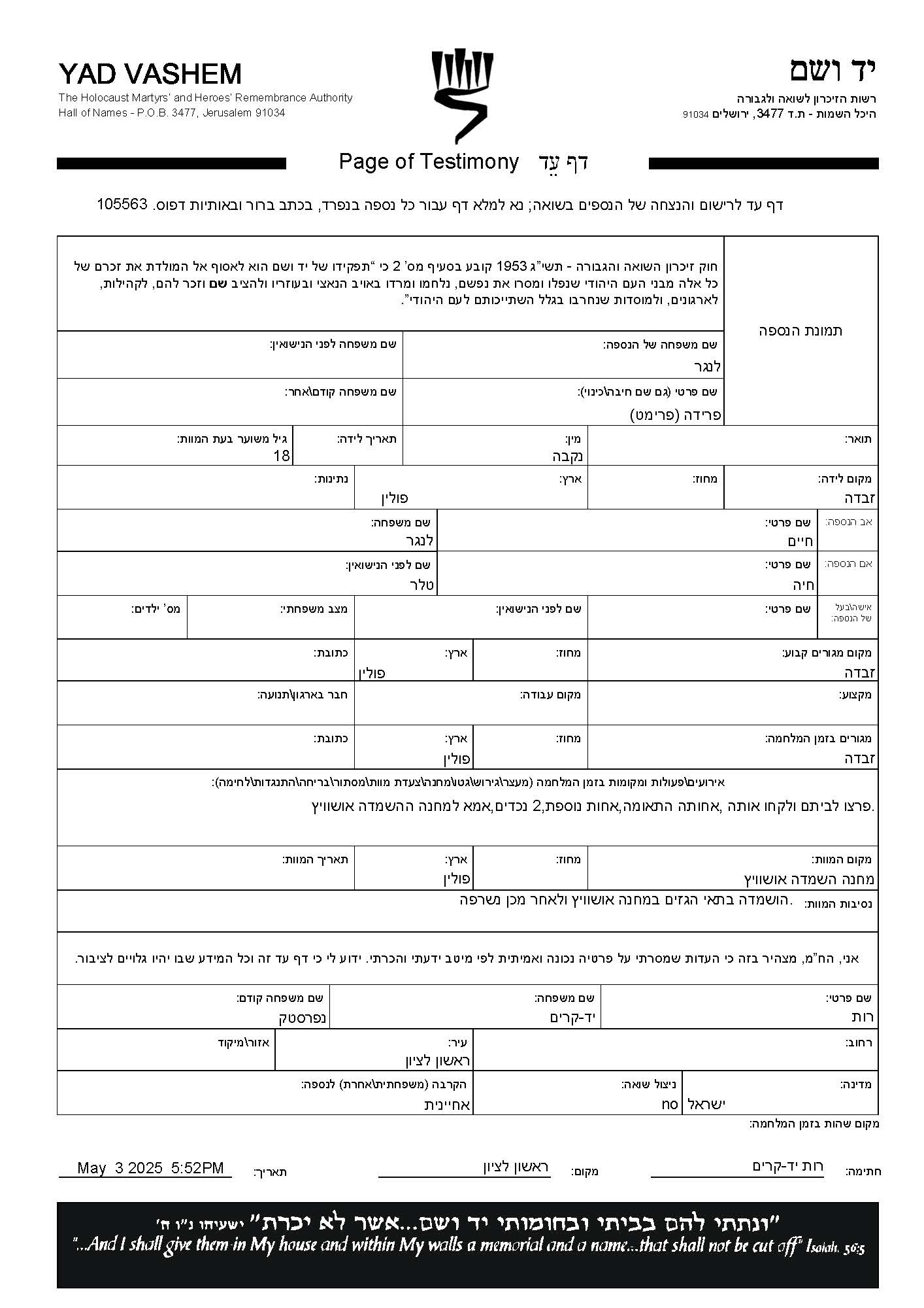 Lenger Frida Frimet Zawada, Poland Page of Testimony (digital)