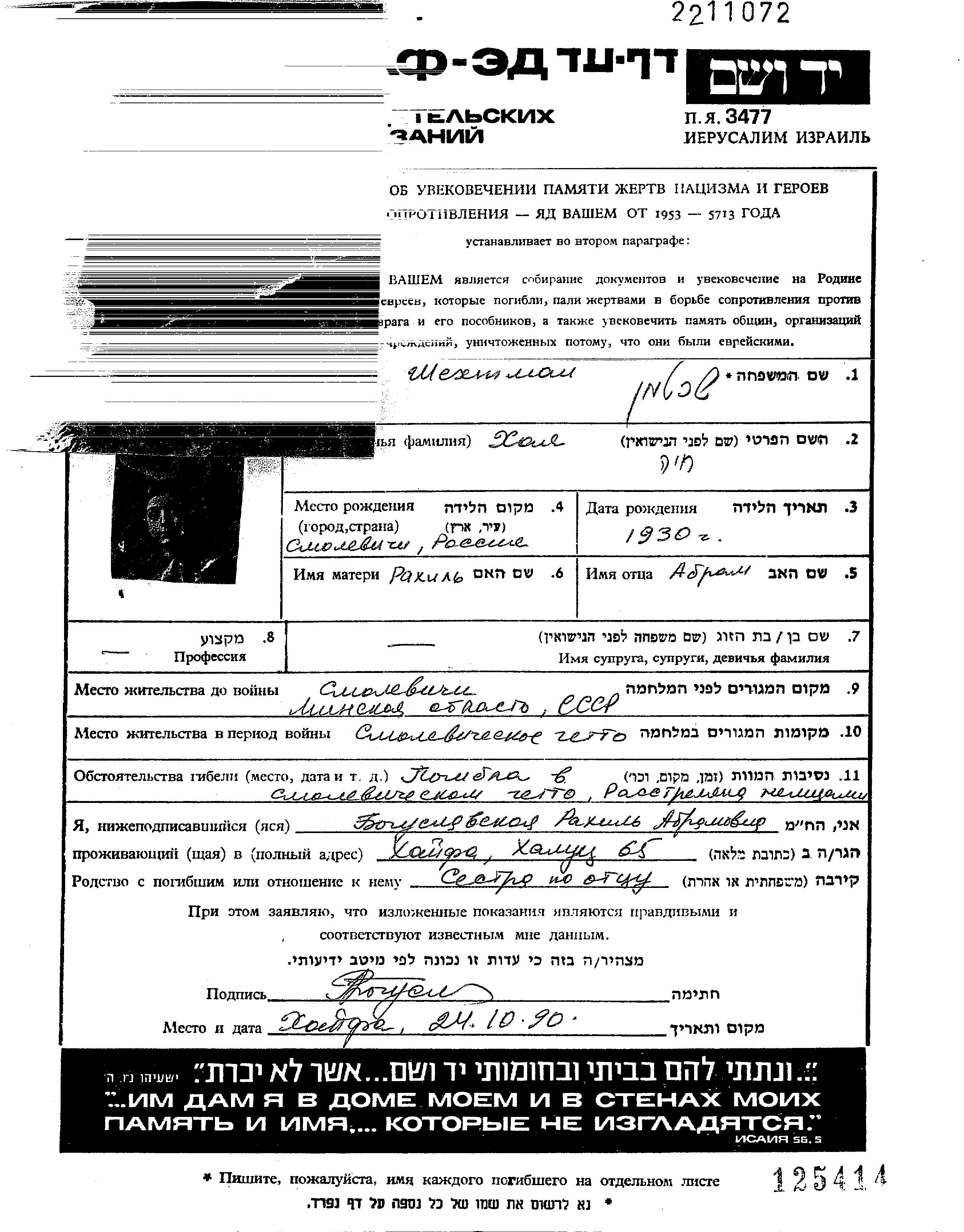 | Shekhtman Boguslavski | Rakhel | Smolevichi, Belorussia (USSR) | Page of Testimony | |