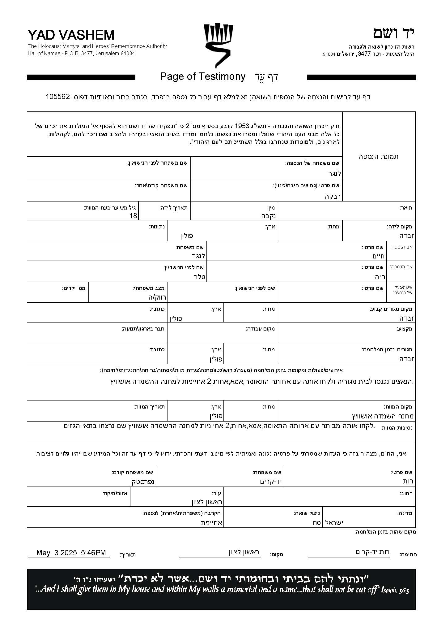 Langer Rivka Zawada, Poland Page of Testimony (digital)
