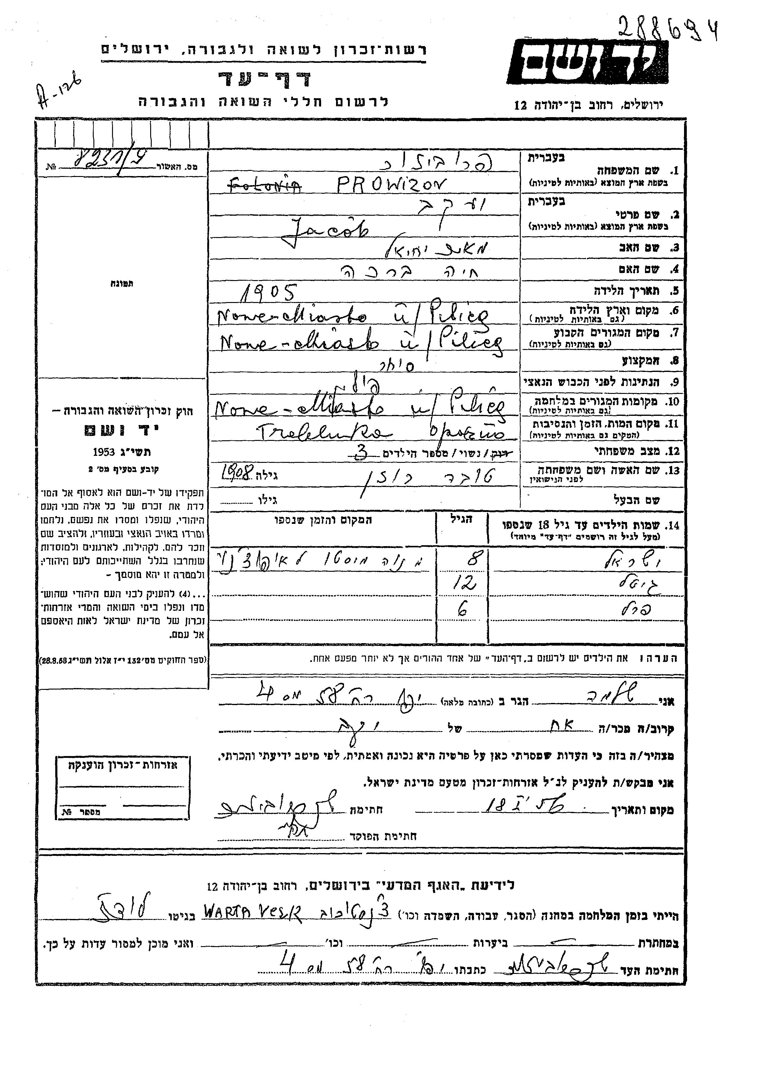 Jakob Prowizor was born in Nowe Miasto, Poland, 1905. He was a merchant. Prior to WWII he lived in Nowe Miasto, Poland. Jakob was murdered in the Shoah. Place of death: Poland, 1941.