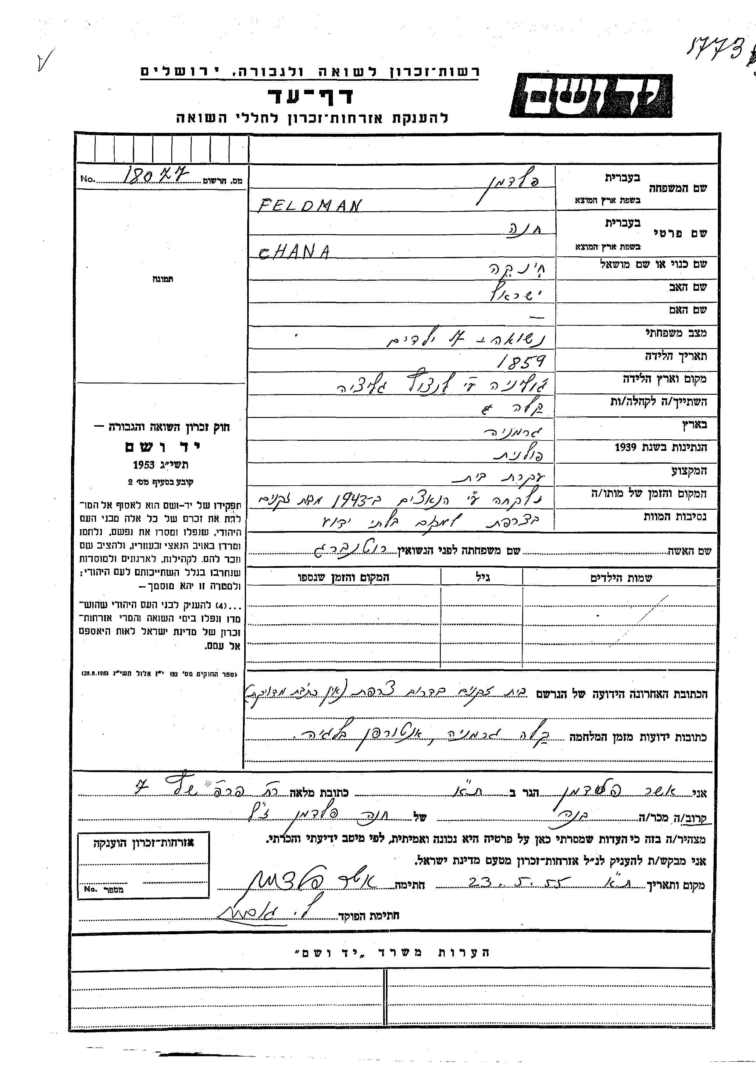 Chana Feldman nee Rutenberg was born in Zolynia, Poland, 1859 to Yisrael. She was a housewife. Prior to WWII she lived in Kahla, Germany. During the war she was in Antwerpen, Belgium.
