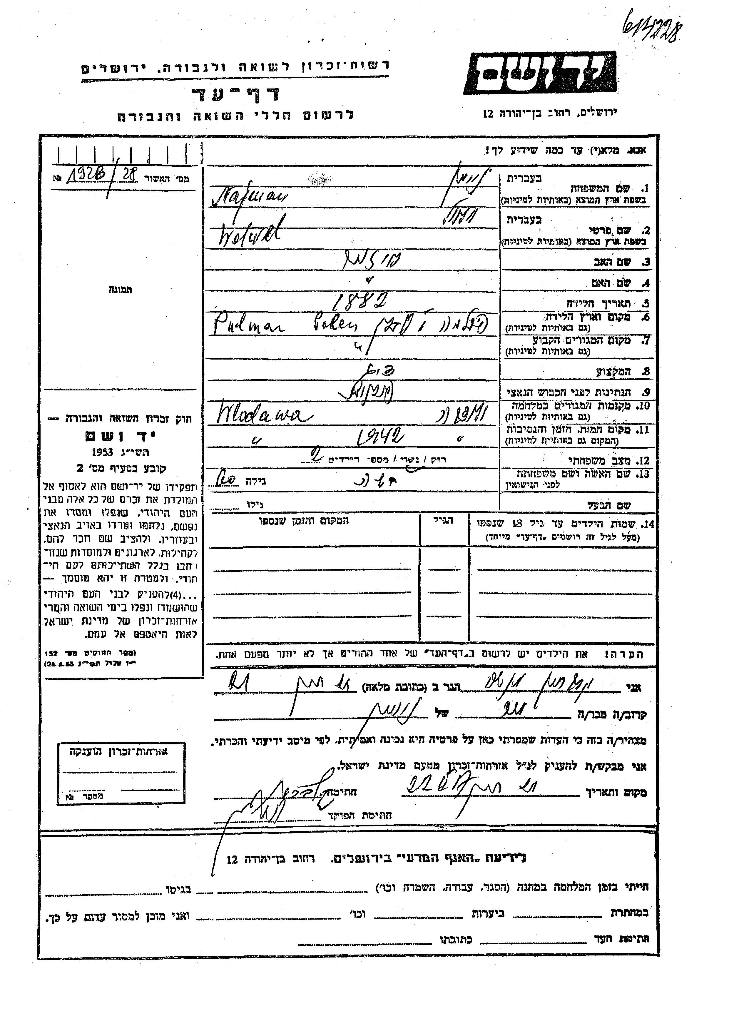 Wolwel Najman was born in Pulmo, Poland, 1882. He was a fisherman and married to Basha. Prior to WWII he lived in Pulmo, Poland. During the war he was in Wlodawa, Poland. Wolwel was murdered in the Shoah. Place of death: Wlodawa, Poland, 1942.