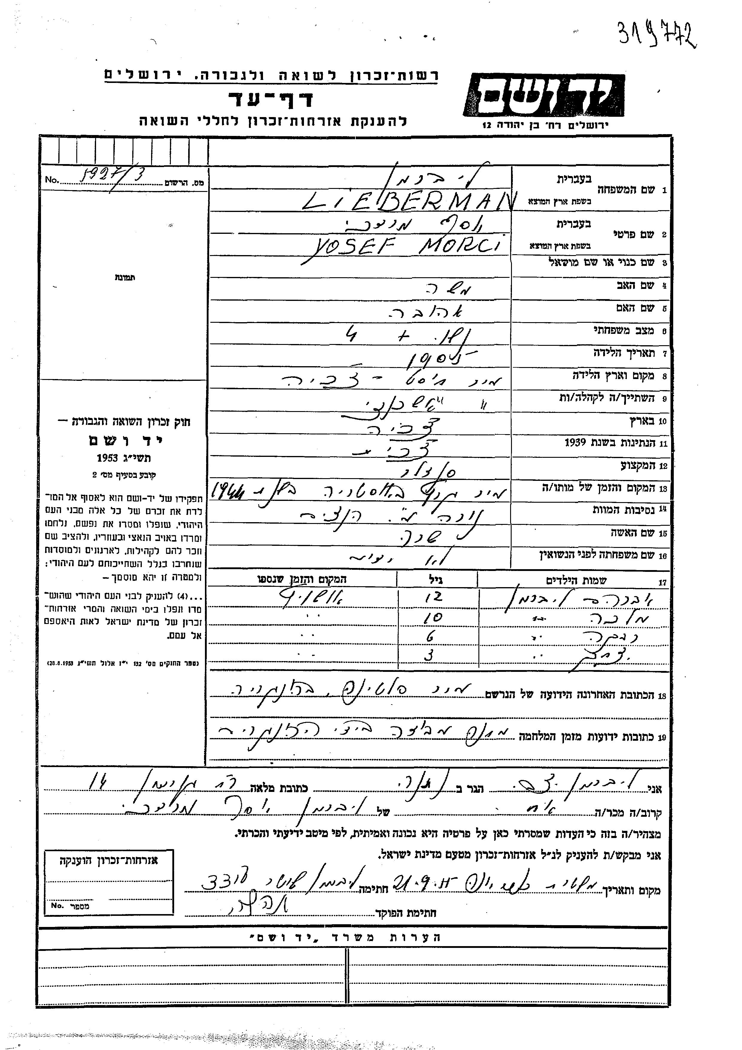 Lieberman Morci Yosef Mordekhai 1905 Hust, Czechoslovakia Page of Testimony