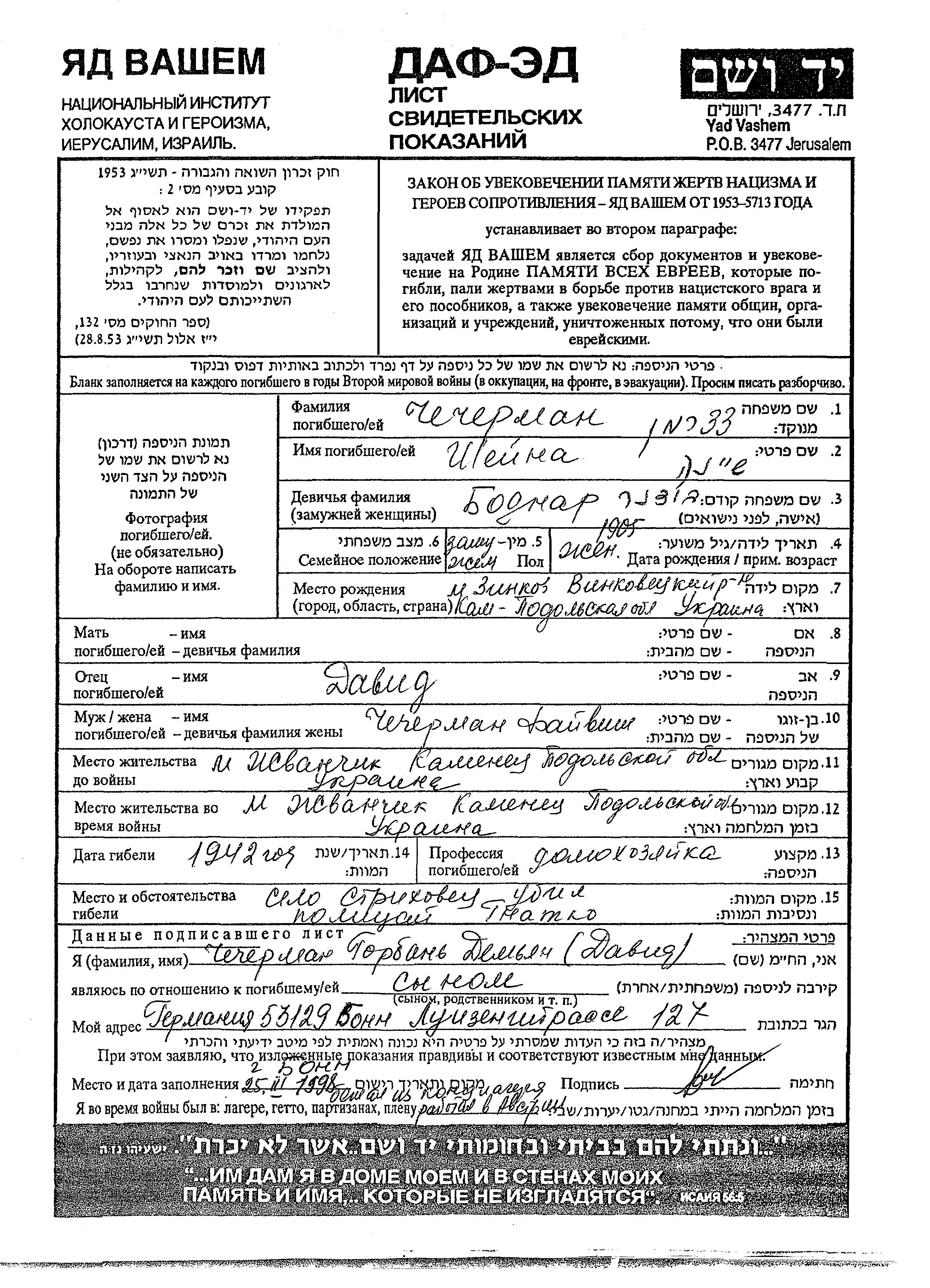Checherman Gorban Demyan David Zhvanchik, Ukraine (USSR) Page of Testimony