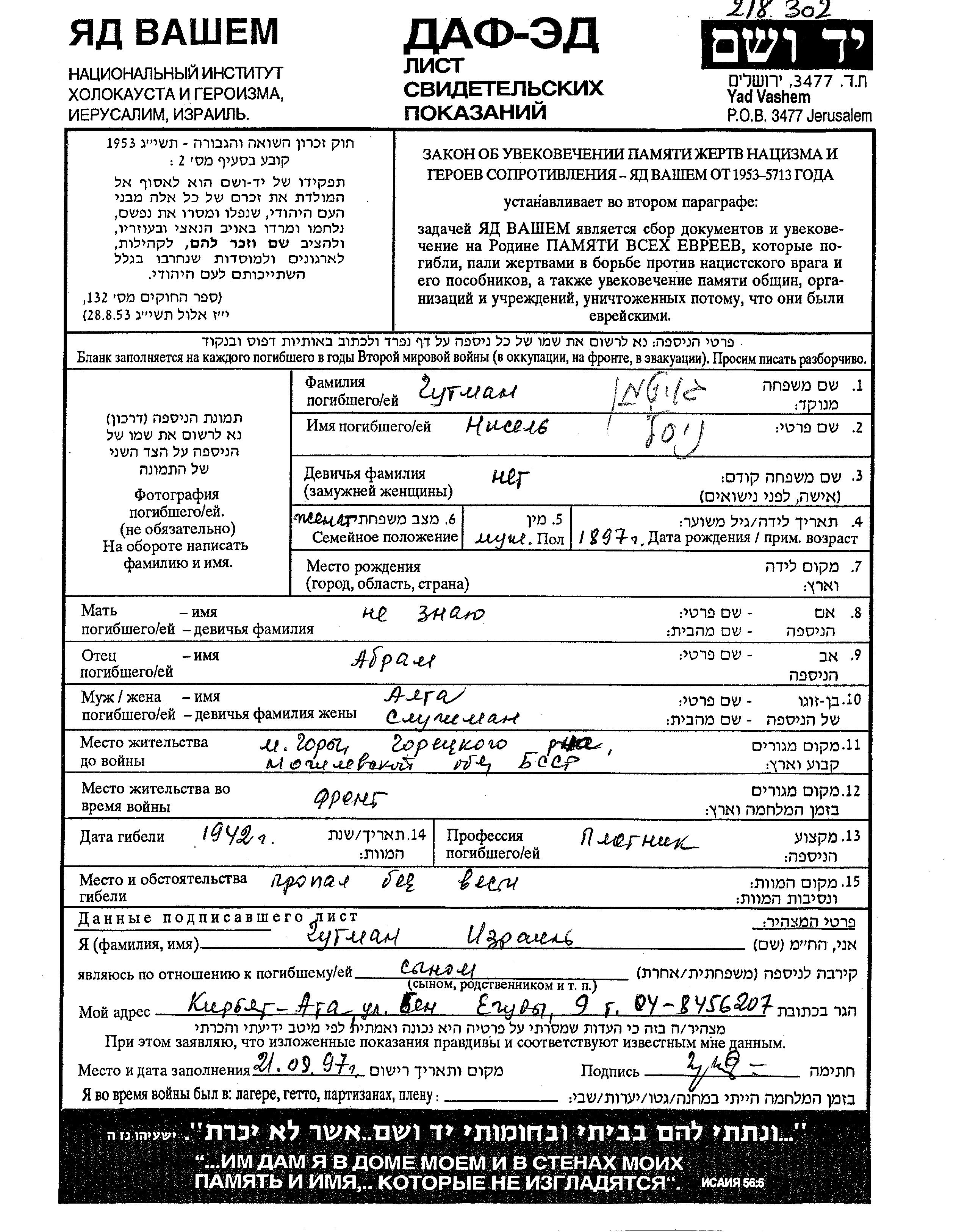 Gutman Yisrael Gory, Belorussia (USSR) Page of Testimony