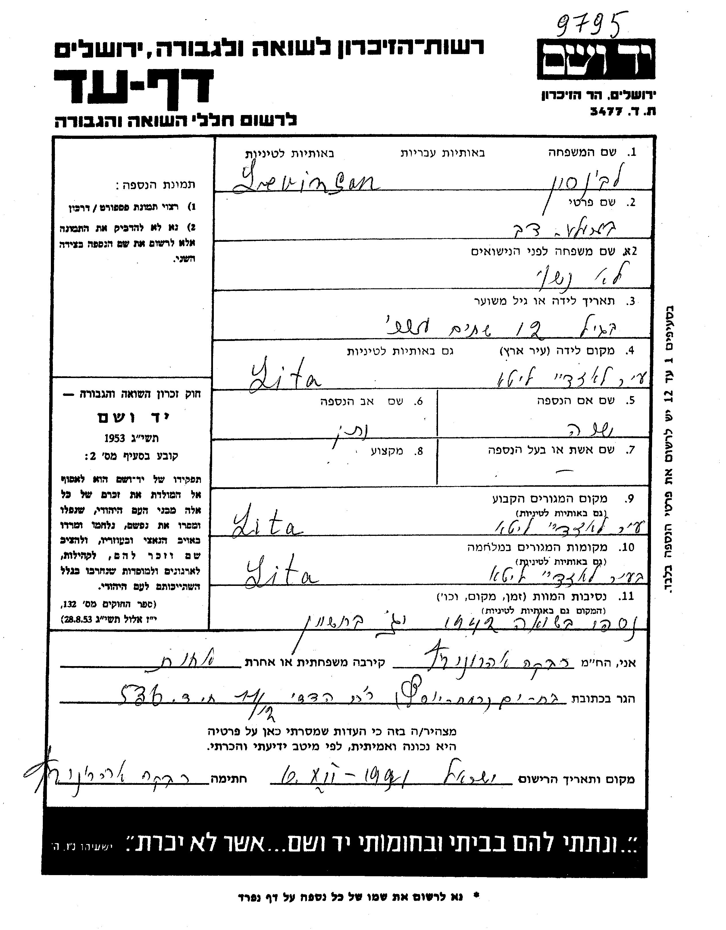 | Levinson Ahronovitz | Rivka | Lazdey, Lithuania | Page of Testimony |