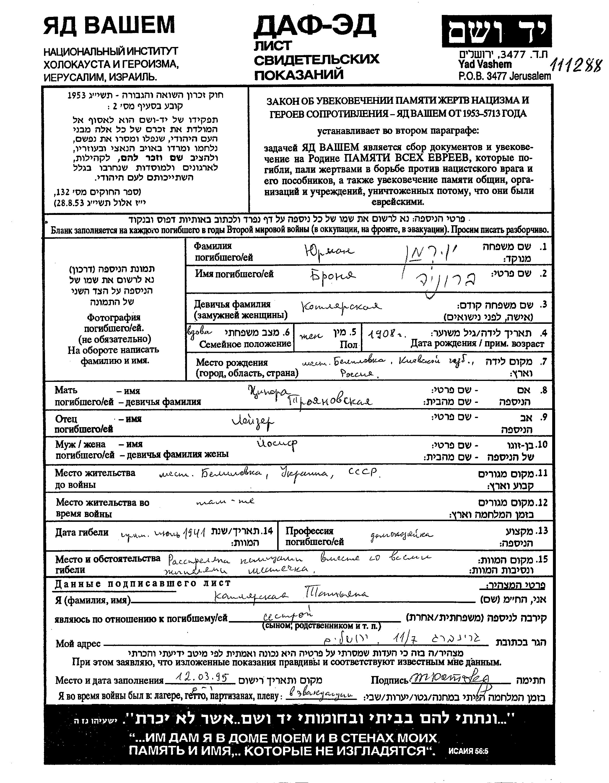 | Kotlyarski | Tatiana | Belilovka, Ukraine (USSR) | Page of Testimony | |