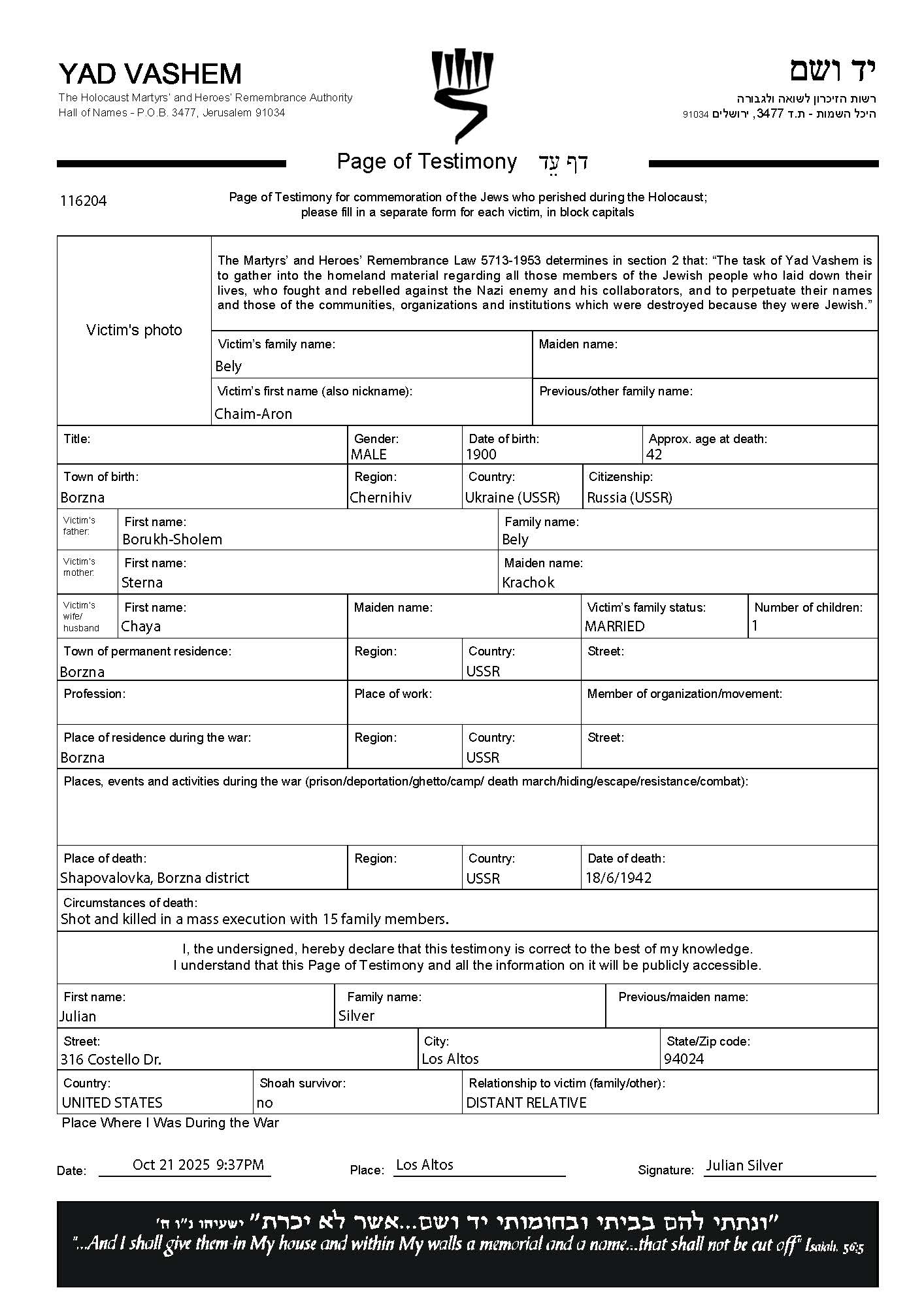 Chaim Aron Bely was born in Borzna, Ukraine (USSR), 1900 to Borukh Sholem and Sterna nee Krachok. He was married to Chaya. Prior to WWII he lived in Borzna, Ukraine (USSR). During the war he was in Borzna, Ukraine (USSR). Chaim Aron was murdered in the Shoah. Place of death: Shapovalovka Area, Ukraine (USSR), 18/06/1942.