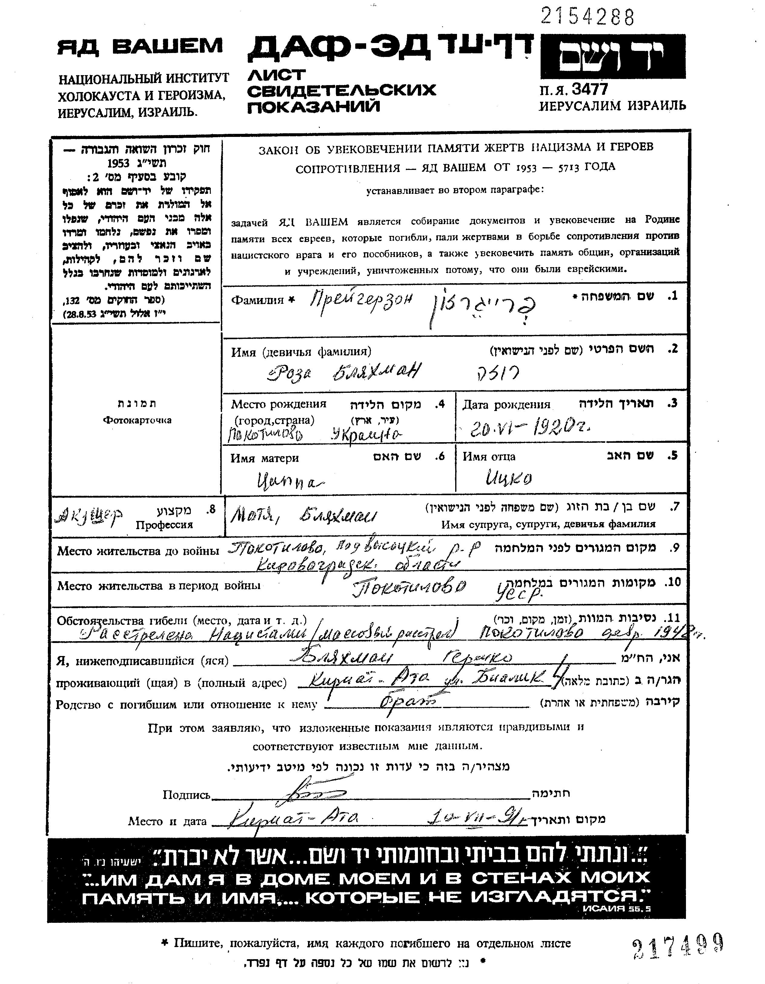 | Blyakhman | Gershko | Pokotilovo, Ukraine (USSR) | Page of Testimony |