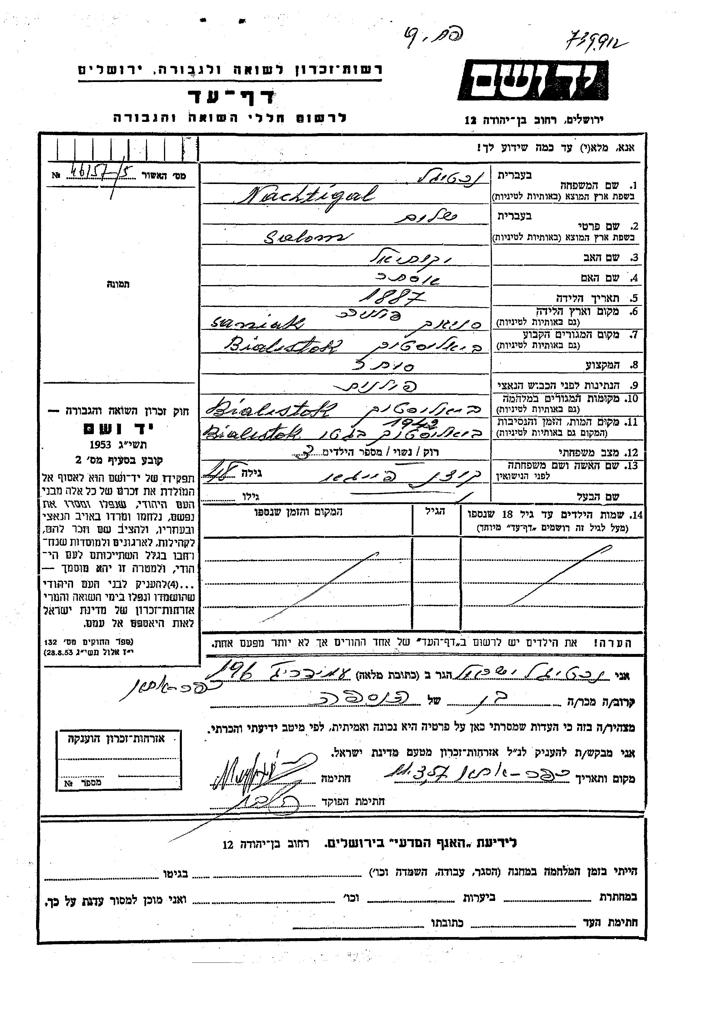 Salom Nachtigal was born in Sanniki, Poland, 1887 to Yekutiel and Ester. He was a merchant and married to Feiga nee Kozen. Prior to WWII he lived in Bialystok, Poland. During the war he was in Bialystok, Poland. Salom was murdered in the Shoah. Place of death: Bialystok, Poland, 1942.