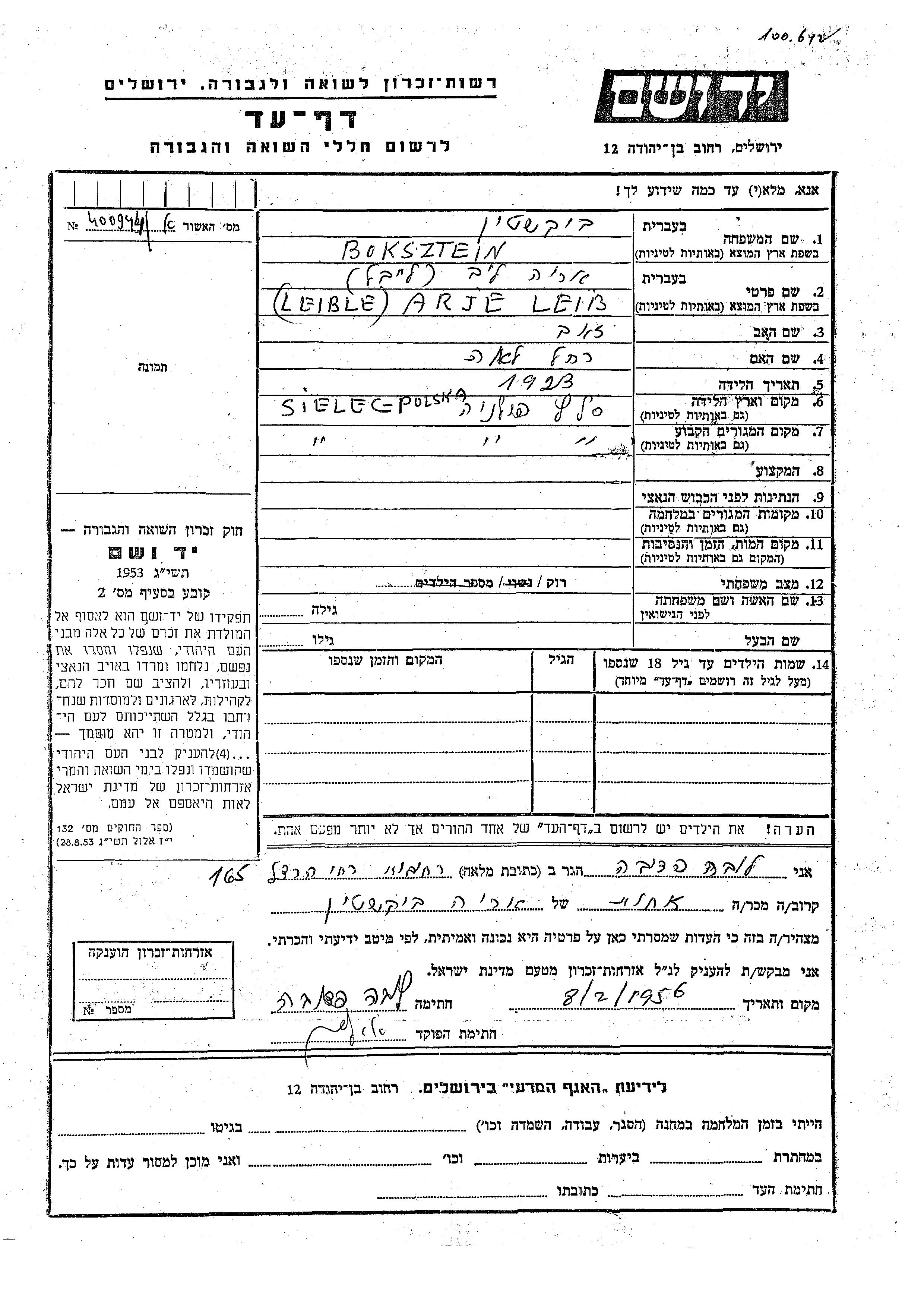 Boksztejn Lejba Arie 1922 Sielec nad Jasiolda, Poland Page of Testimony