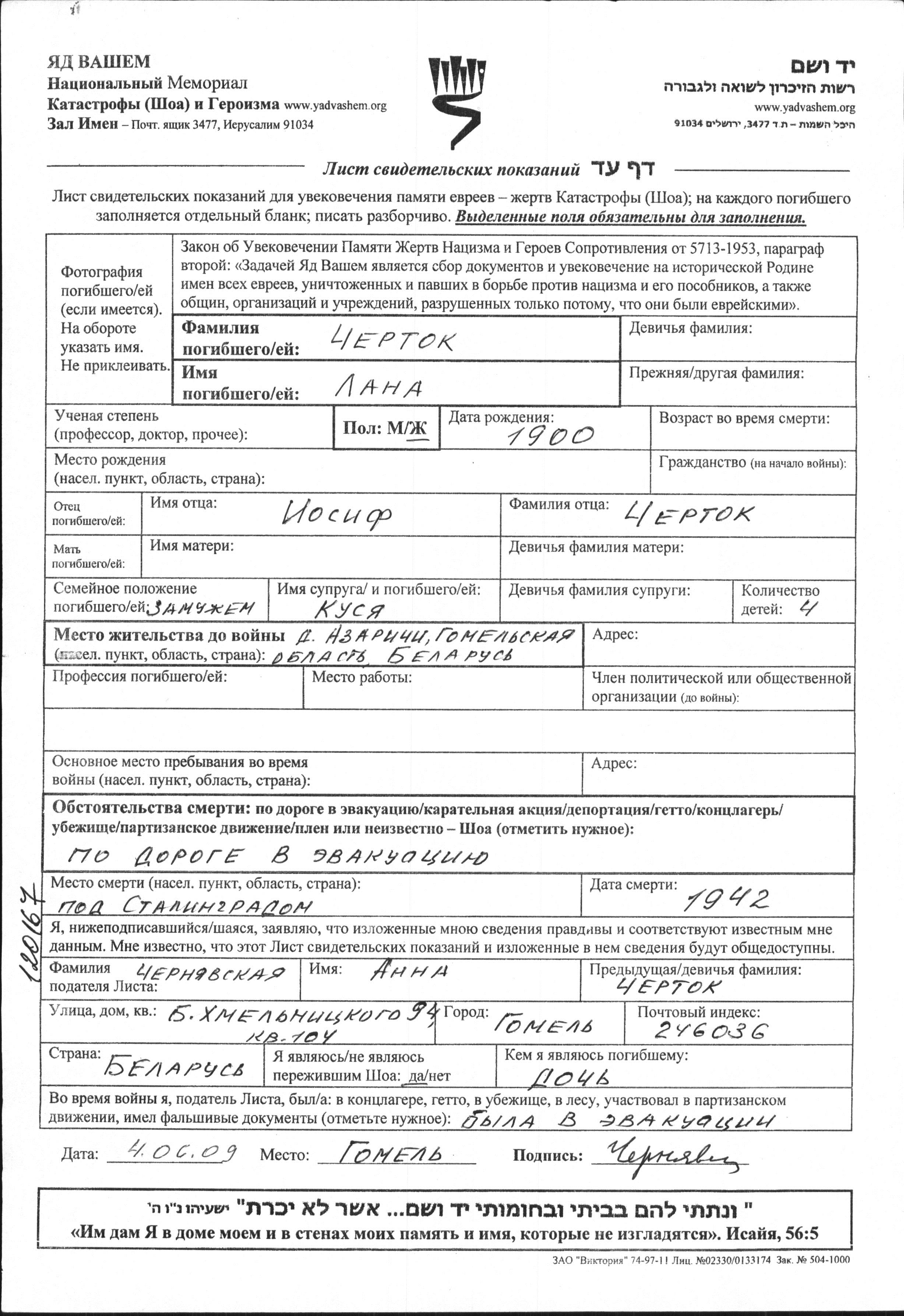 Anna Chertok Chernyavskaya was born to Kusya and Lana. Prior to WWII she lived in Azarichi, Belorussia (USSR). Anna was registered following the evacuation/ in the interior of the Soviet Union.