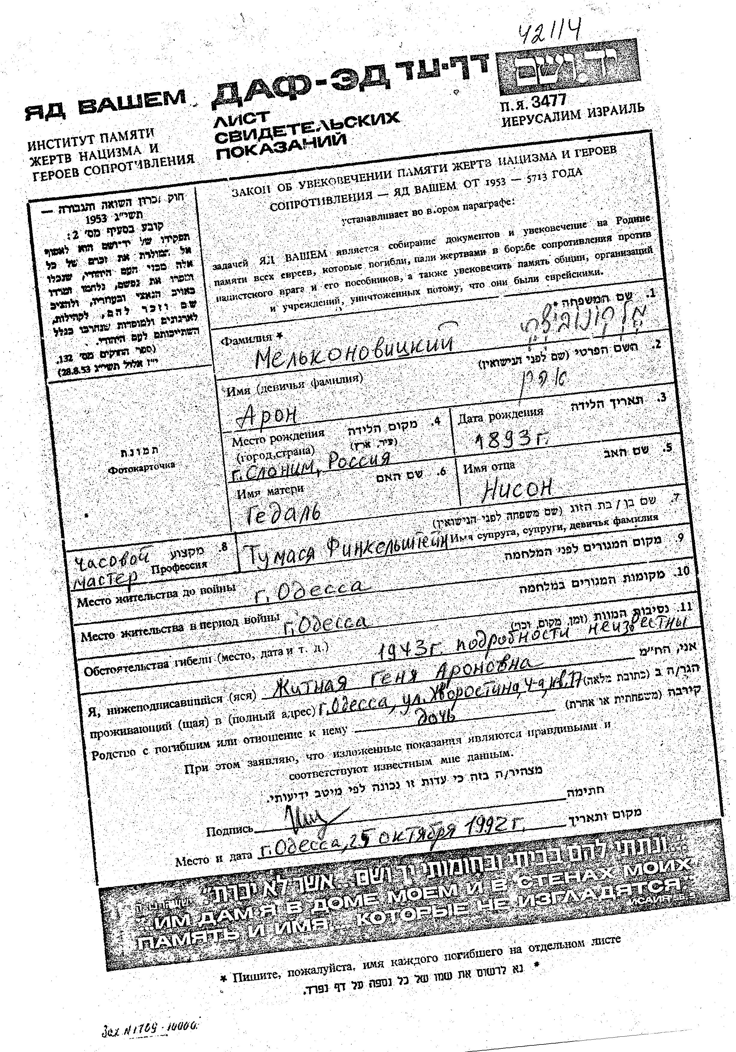 Melkonovitzki Aron 1893 Odessa, Ukraine (USSR) Page of Testimony