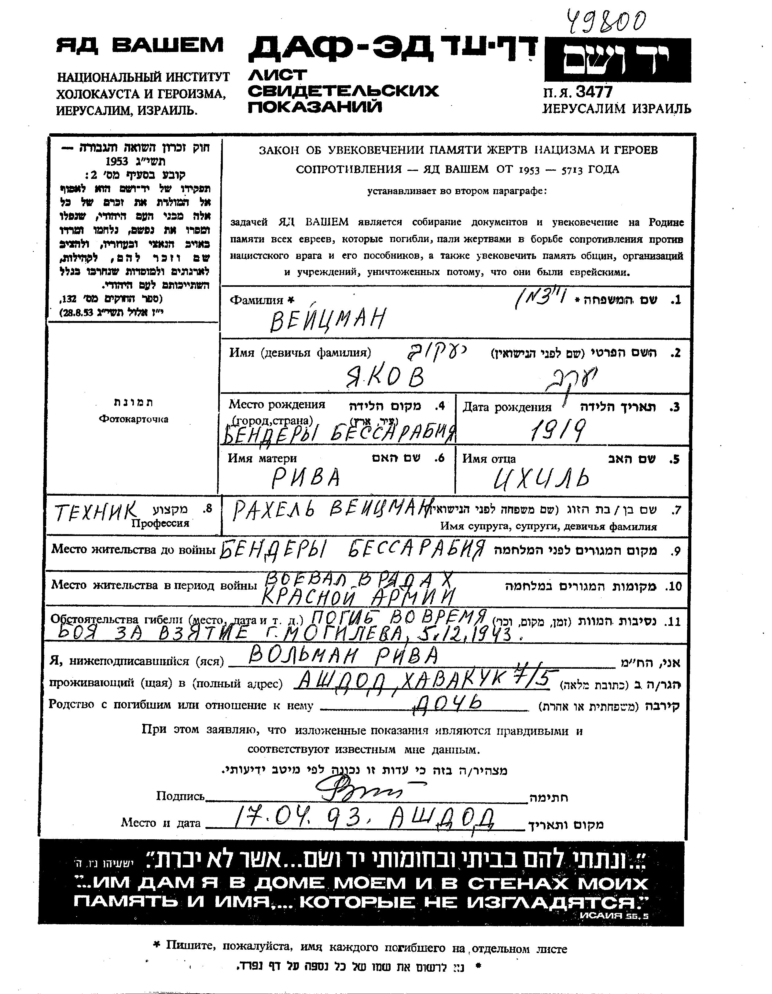 Yakov Veitzman was born in Bendery, Romania, 1919 to Ikhil and Riva. He was a technician and married to Rakhel. Prior to WWII he lived in Bendery, Romania. During the war he was in the Soviet armed forces. Yakov was killed in military service in WWII. Place of death: Mogilev, Belorussia (USSR), 05/12/1943.