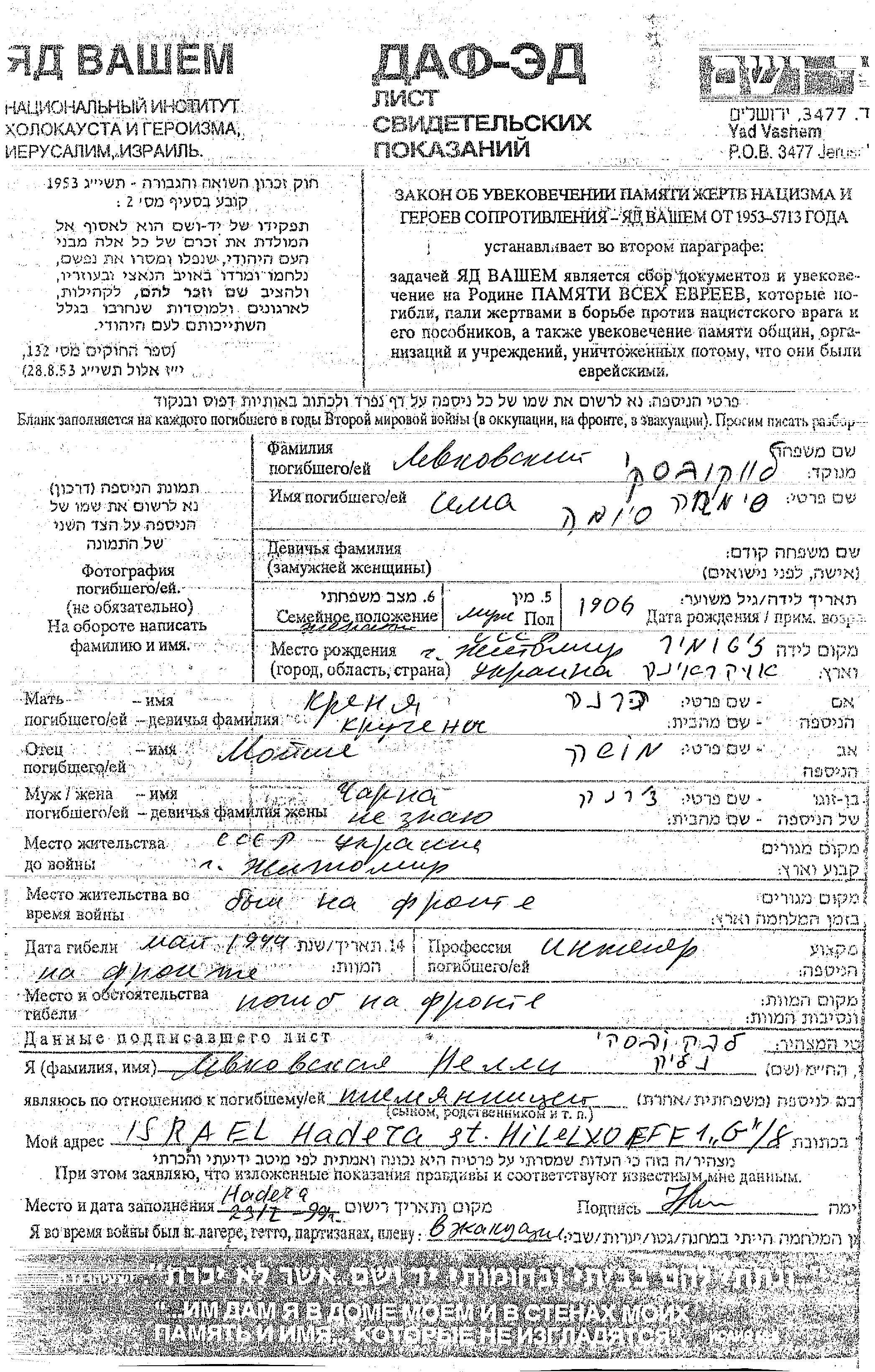 Simkha Sioma Sima Levkovski was born in Zitomir, Ukraine (USSR), 1906. He was an engineer. Prior to WWII he lived in Zitomir, Ukraine (USSR). Simkha Sioma Sima was killed in military service in WWII. Place of death: unstated place, 1944.