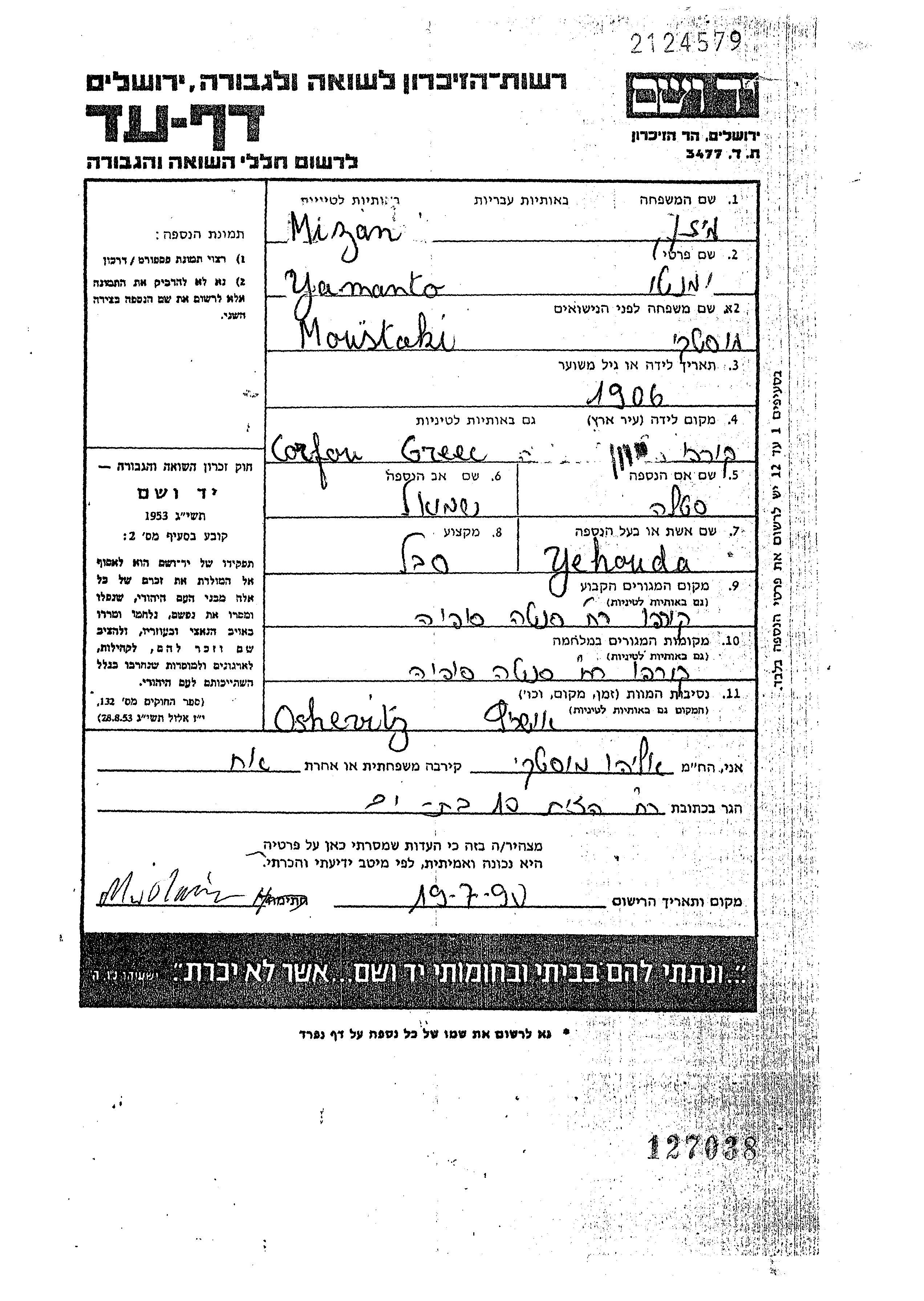 Mizan Yamanto 1906 Corfu, Greece Page of Testimony