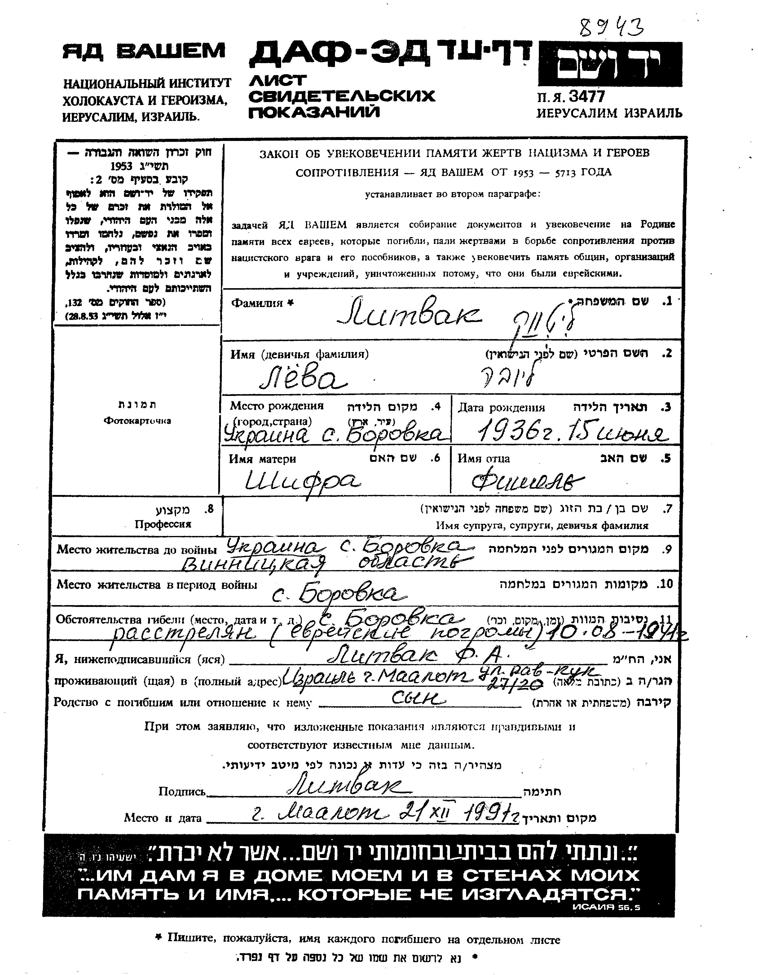 Liuba Litvak was born in Borovka, Ukraine (USSR), 1936 to Fishel and Shifra. She was child. Prior to WWII she lived in Borovka, Ukraine (USSR). During the war she was in Borovka, Ukraine (USSR). Liuba was murdered in the Shoah. Place of death: Borovka, Ukraine (USSR), 10/08/1941.
