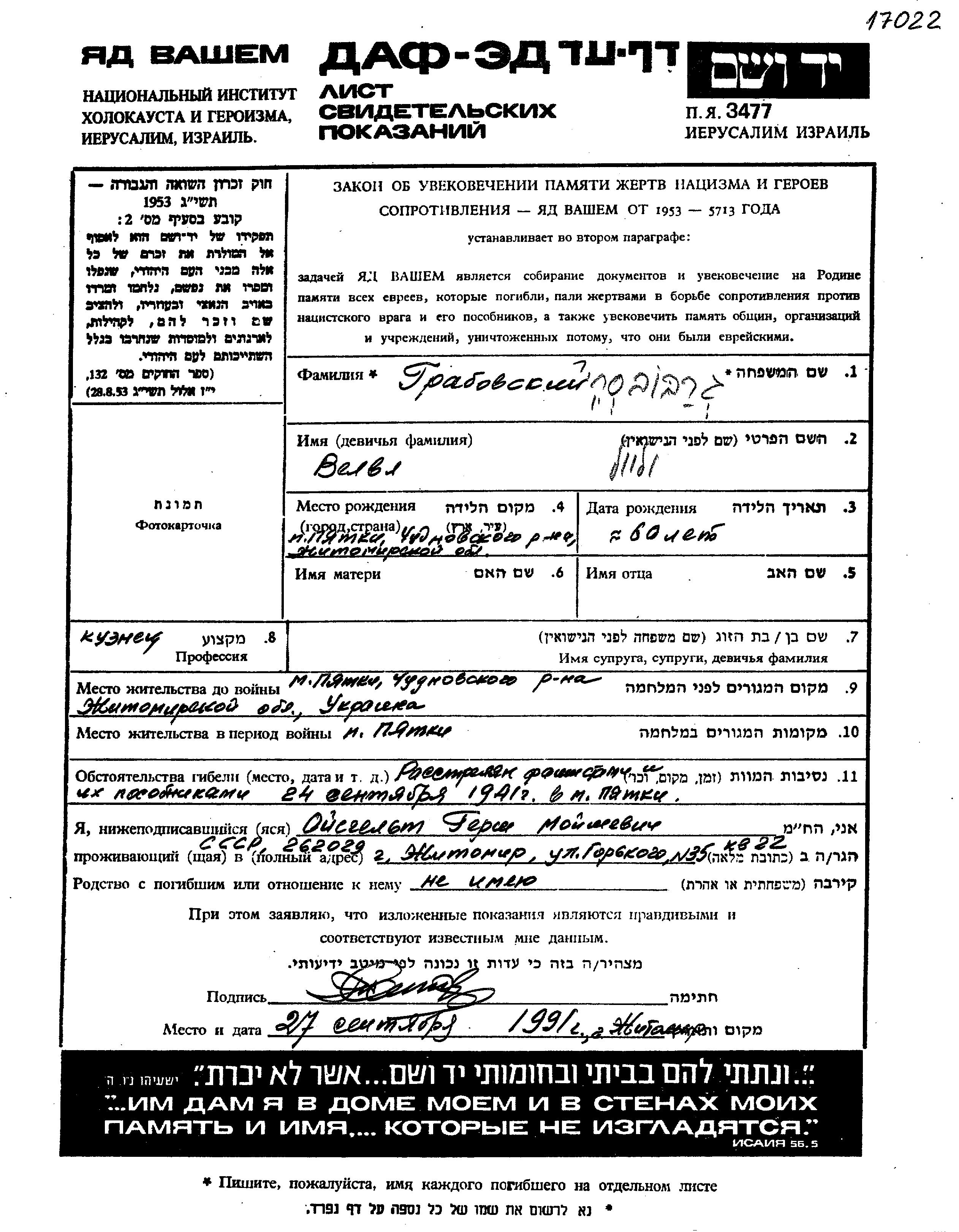 Velvl Grabovski was born in Pyatka, Ukraine (USSR), 1881. He was a blacksmith. Prior to WWII he lived in Pyatka, Ukraine (USSR). During the war he was in Pyatka, Ukraine (USSR). Velvl was murdered in the Shoah. Place of death: Pyatka, Ukraine (USSR), 24/09/1941.