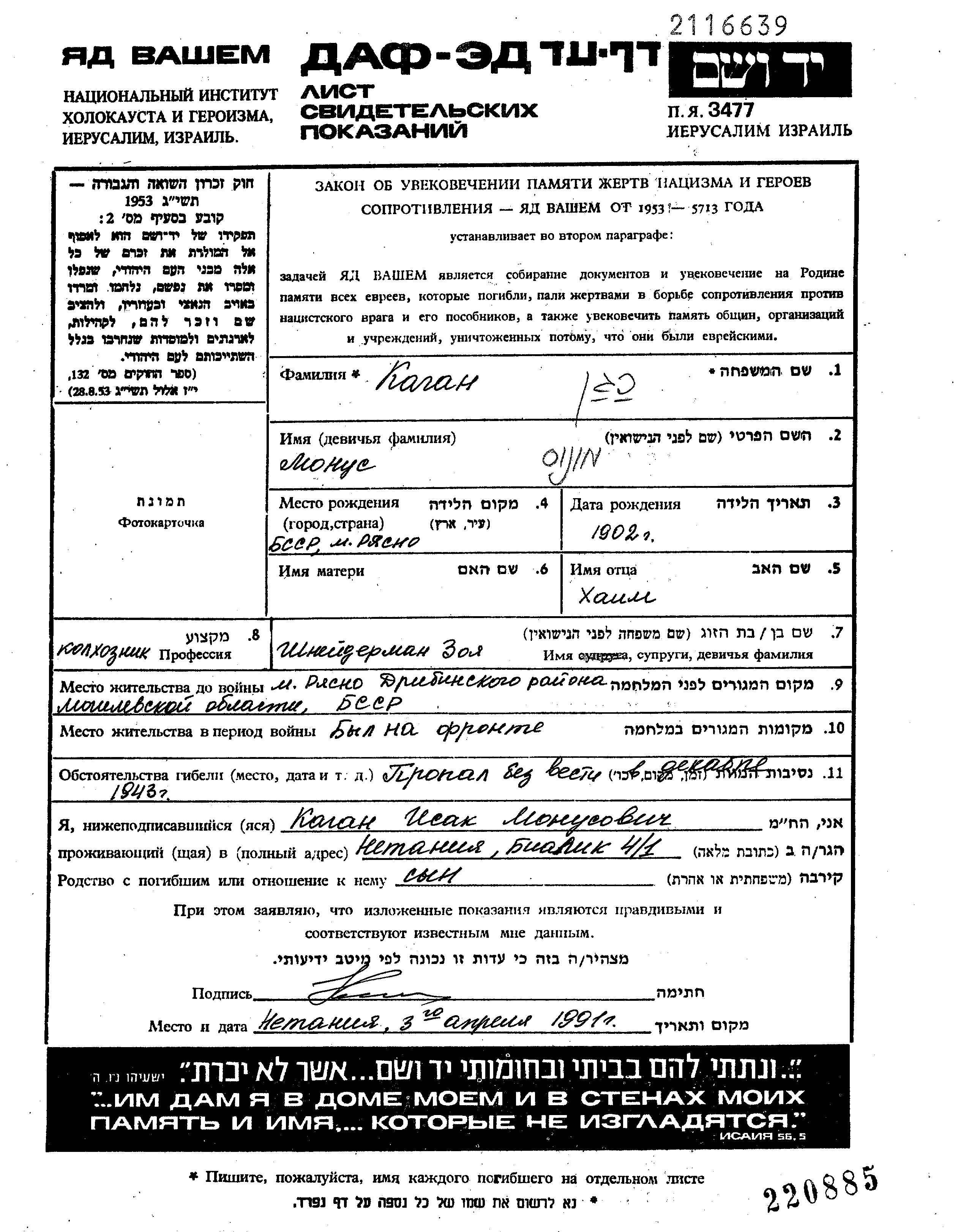Kagan Monus Mones Ryasna, Belorussia (USSR) Page of Testimony