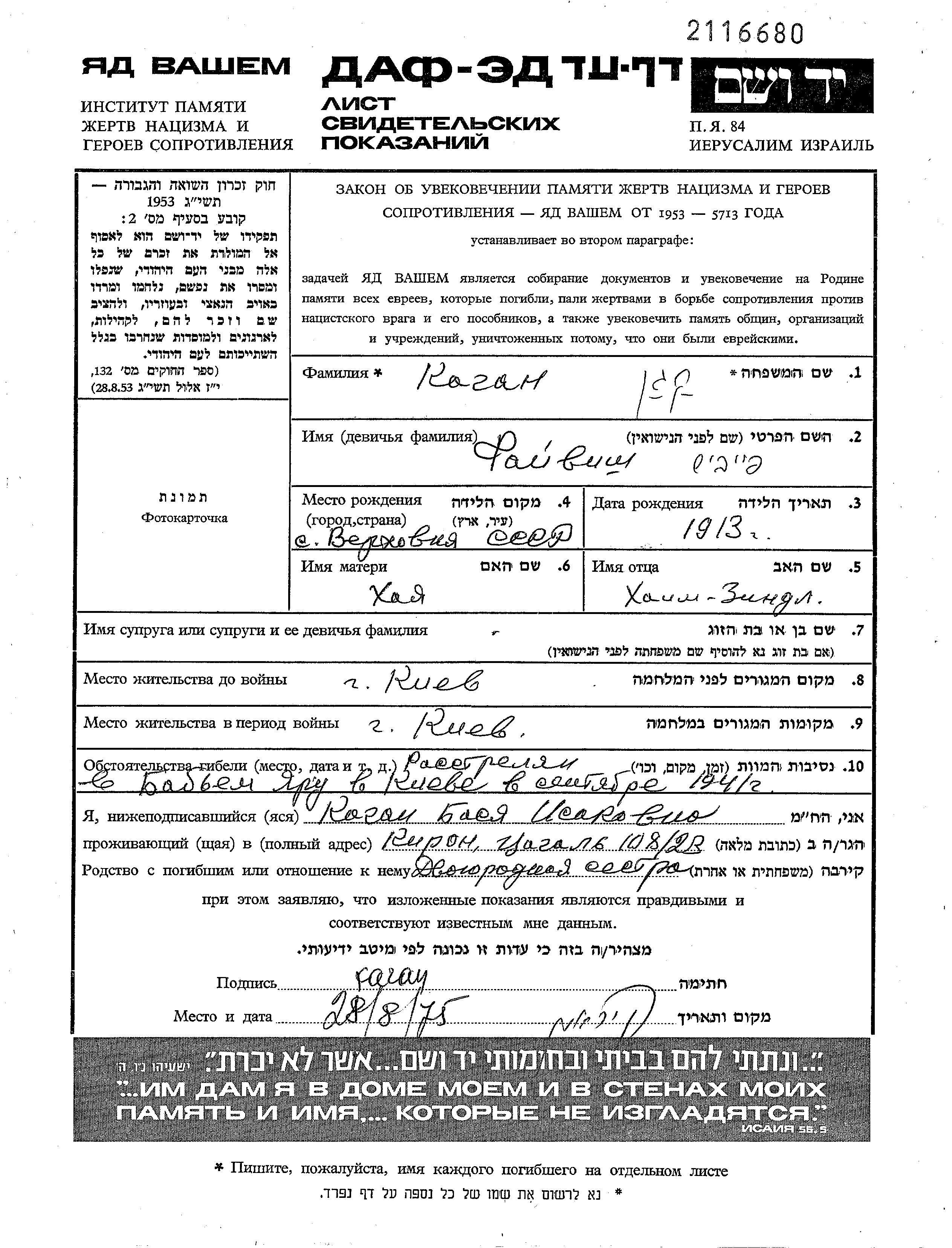 Kagan Faivish Kiyev, Ukraine (USSR) Page of Testimony