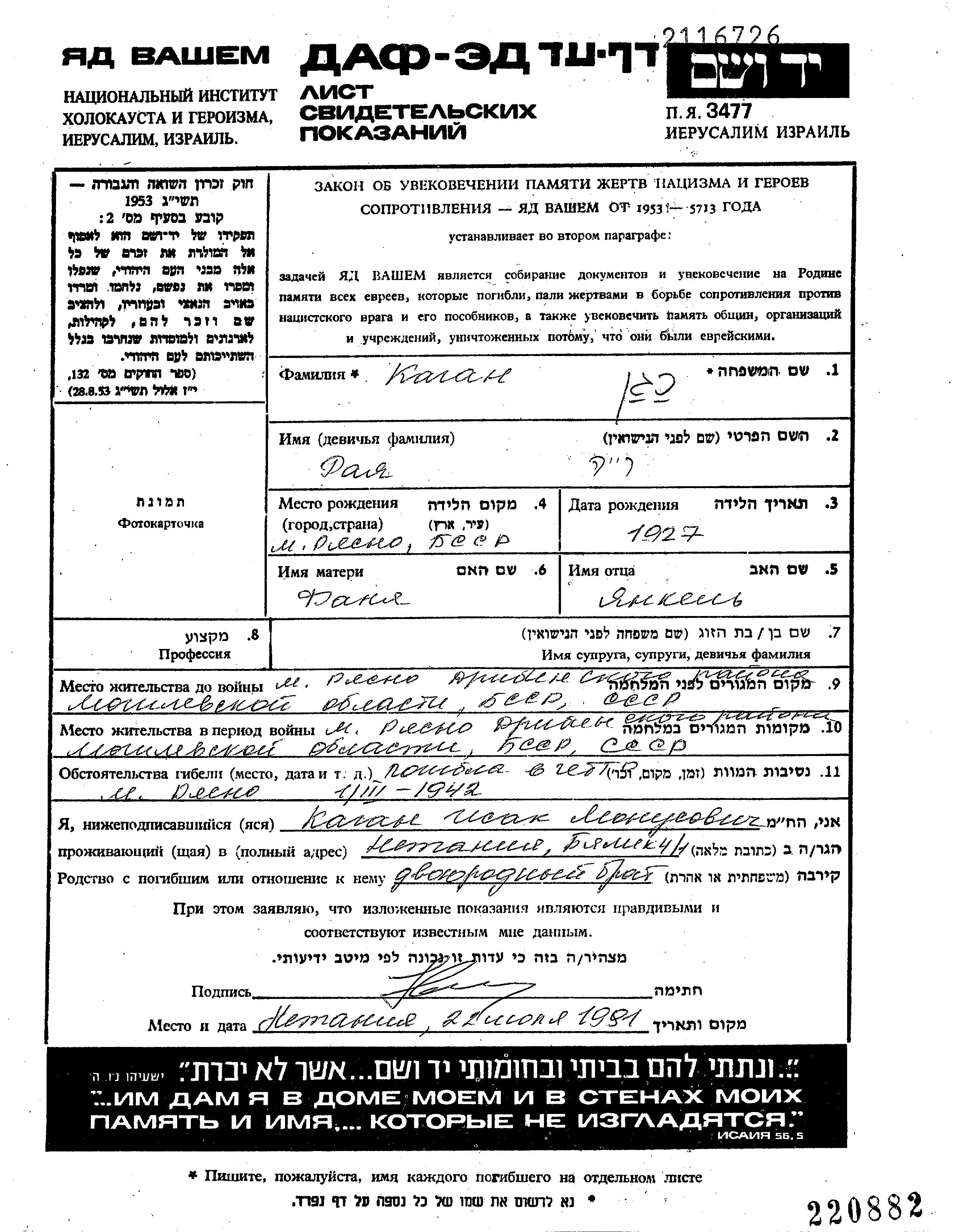 Kagan Raya Ryasna, Belorussia (USSR) Page of Testimony