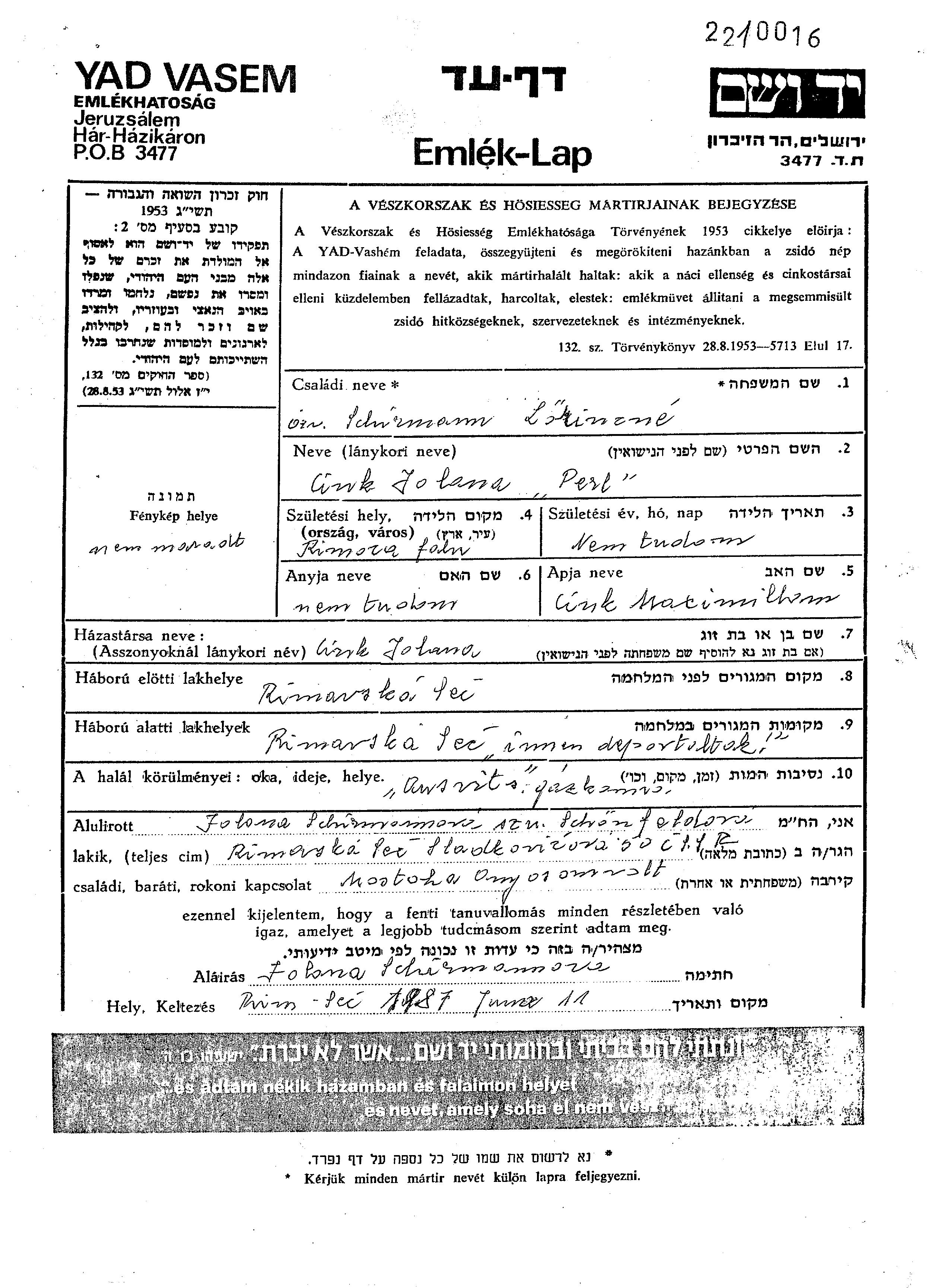 Schirmann Yolana Rimavska Sec, Czechoslovakia Page of Testimony