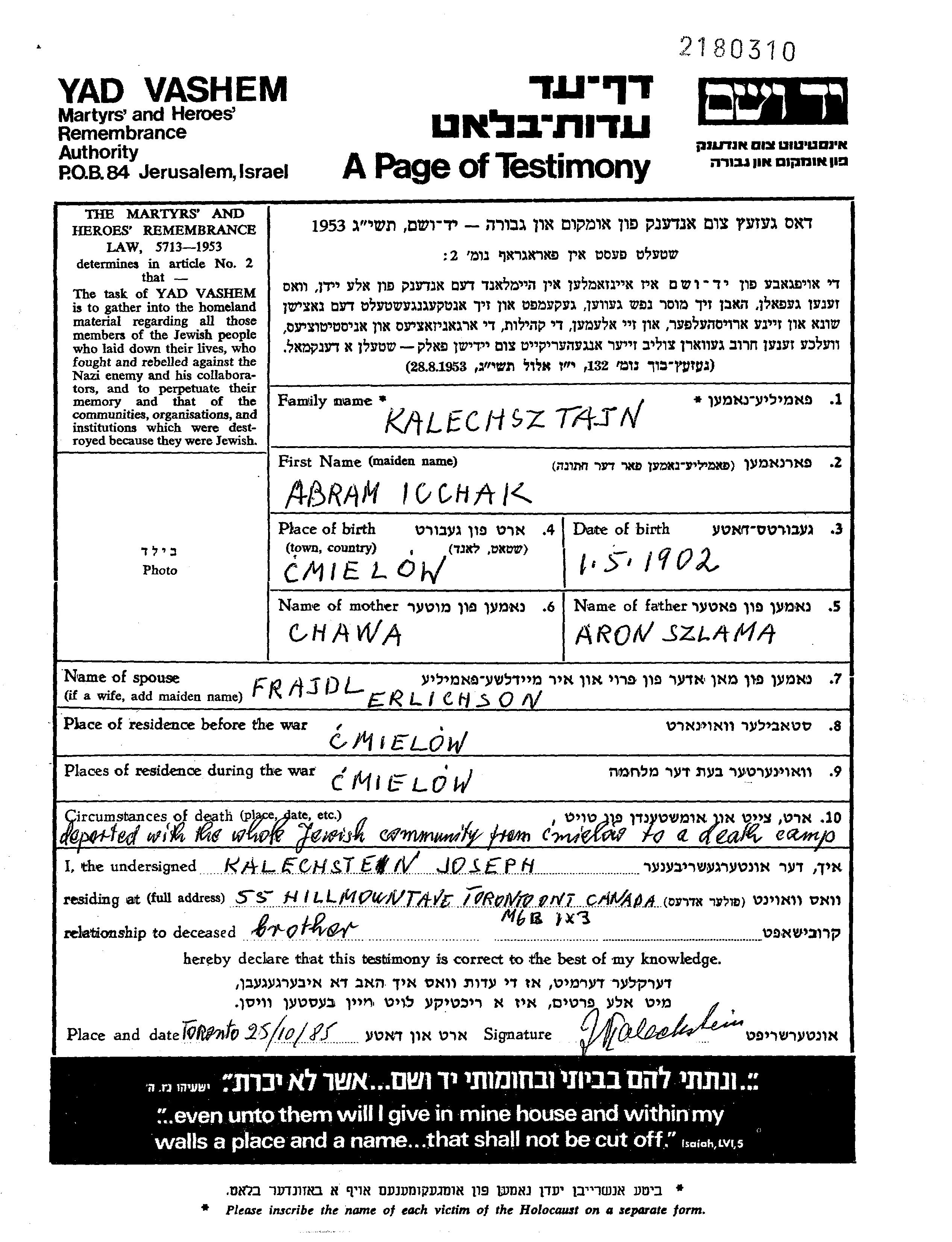 Kalechsztajn Abram Icchak 1902 Cmielow, Poland Page of Testimony