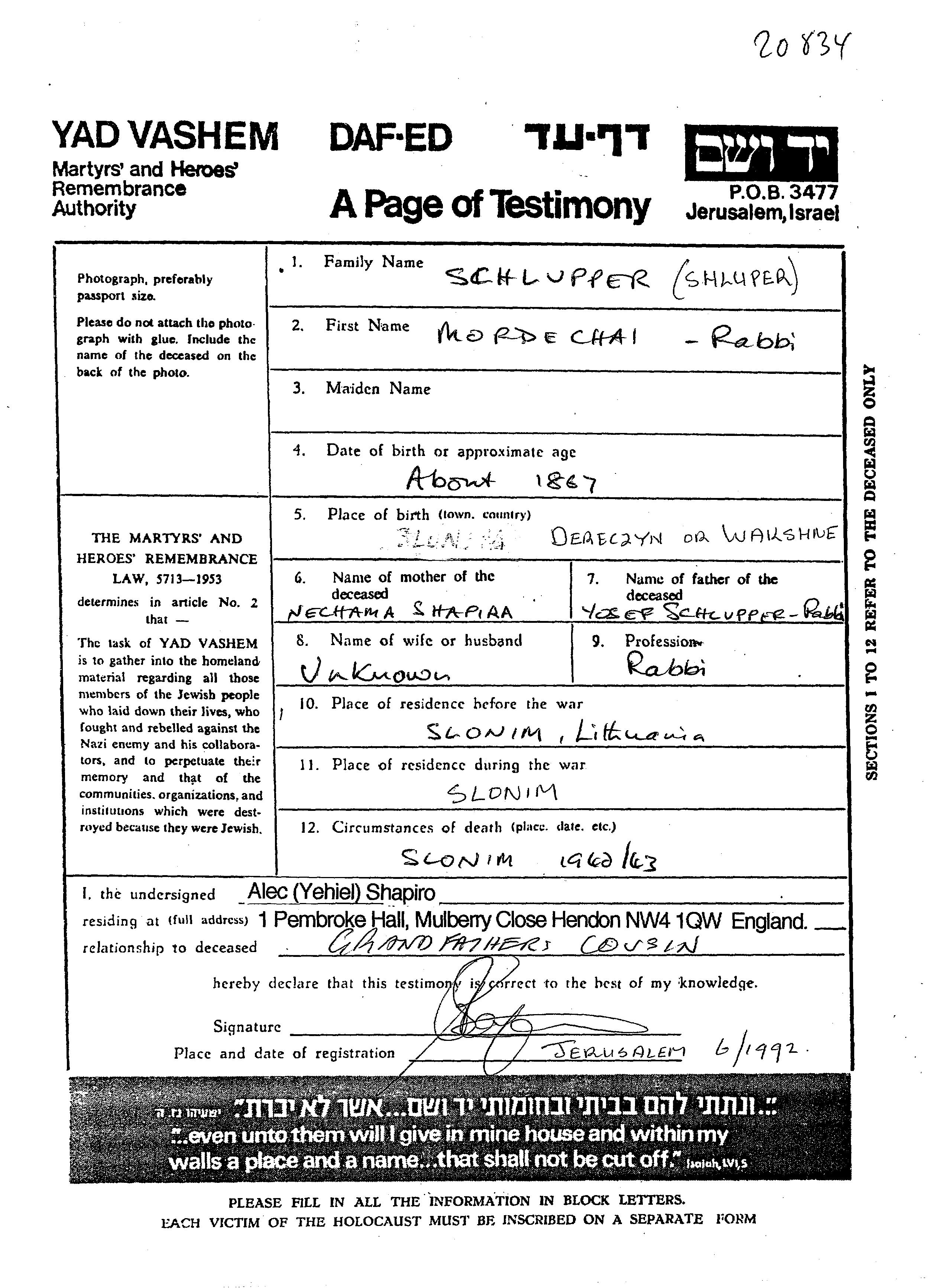 Schlupper Mordechai 1867 Slonim, Poland Page of Testimony